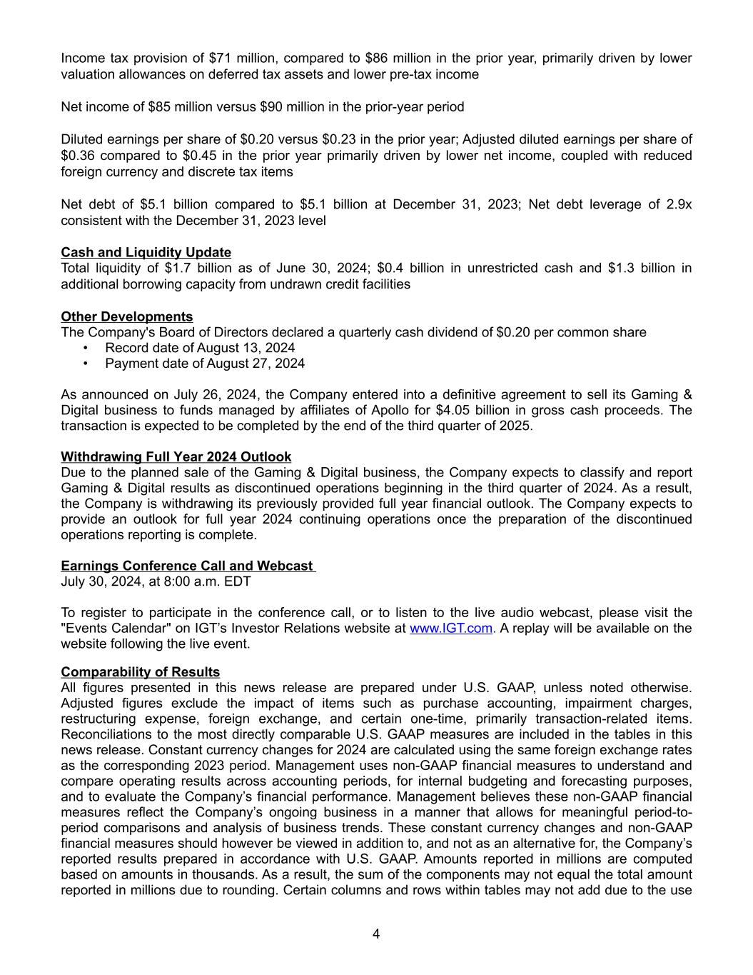 Income tax provision of $71 million, compared to $86 million in the prior year, primarily driven by lower valuation allowances on deferred tax assets and lower pre-tax income Net income of $85 million versus $90 million in the prior-year period Diluted earnings per share of $0.20 versus $0.23 in the prior year; Adjusted diluted earnings per share of $0.36 compared to $0.45 in the prior year primarily driven by lower net income, coupled with reduced foreign currency and discrete tax items Net debt of $5.1 billion compared to $5.1 billion at December 31, 2023; Net debt leverage of 2.9x consistent with the December 31, 2023 level Cash and Liquidity Update Total liquidity of $1.7 billion as of June 30, 2024; $0.4 billion in unrestricted cash and $1.3 billion in additional borrowing capacity from undrawn credit facilities Other Developments The Company's Board of Directors declared a quarterly cash dividend of $0.20 per common share • Record date of August 13, 2024 • Payment date of August 27, 2024 As announced on July 26, 2024, the Company entered into a definitive agreement to sell its Gaming & Digital business to funds managed by affiliates of Apollo for $4.05 billion in gross cash proceeds. The transaction is expected to be completed by the end of the third quarter of 2025. Withdrawing Full Year 2024 Outlook Due to the planned sale of the Gaming & Digital business, the Company expects to classify and report Gaming & Digital results as discontinued operations beginning in the third quarter of 2024. As a result, the Company is withdrawing its previously provided full year financial outlook. The Company expects to provide an outlook for full year 2024 continuing operations once the preparation of the discontinued operations reporting is complete. Earnings Conference Call and Webcast July 30, 2024, at 8:00 a.m. EDT To register to participate in the conference call, or to listen to the live audio webcast, please visit the "Events Calendar" on IGT’s Investor Relations website at www.IGT.com. A replay will be available on the website following the live event. Comparability of Results All figures presented in this news release are prepared under U.S. GAAP, unless noted otherwise. Adjusted figures exclude the impact of items such as purchase accounting, impairment charges, restructuring expense, foreign exchange, and certain one-time, primarily transaction-related items. Reconciliations to the most directly comparable U.S. GAAP measures are included in the tables in this news release. Constant currency changes for 2024 are calculated using the same foreign exchange rates as the corresponding 2023 period. Management uses non-GAAP financial measures to understand and compare operating results across accounting periods, for internal budgeting and forecasting purposes, and to evaluate the Company’s financial performance. Management believes these non-GAAP financial measures reflect the Company’s ongoing business in a manner that allows for meaningful period-to- period comparisons and analysis of business trends. These constant currency changes and non-GAAP financial measures should however be viewed in addition to, and not as an alternative for, the Company’s reported results prepared in accordance with U.S. GAAP. Amounts reported in millions are computed based on amounts in thousands. As a result, the sum of the components may not equal the total amount reported in millions due to rounding. Certain columns and rows within tables may not add due to the use 4
