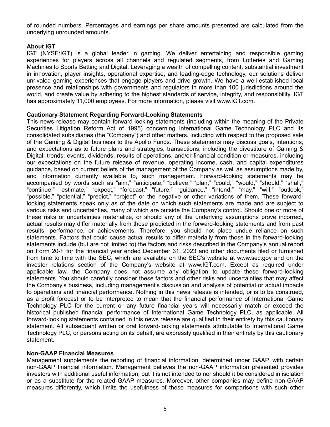 of rounded numbers. Percentages and earnings per share amounts presented are calculated from the underlying unrounded amounts. About IGT IGT (NYSE:IGT) is a global leader in gaming. We deliver entertaining and responsible gaming experiences for players across all channels and regulated segments, from Lotteries and Gaming Machines to Sports Betting and Digital. Leveraging a wealth of compelling content, substantial investment in innovation, player insights, operational expertise, and leading-edge technology, our solutions deliver unrivaled gaming experiences that engage players and drive growth. We have a well-established local presence and relationships with governments and regulators in more than 100 jurisdictions around the world, and create value by adhering to the highest standards of service, integrity, and responsibility. IGT has approximately 11,000 employees. For more information, please visit www.IGT.com. Cautionary Statement Regarding Forward-Looking Statements This news release may contain forward-looking statements (including within the meaning of the Private Securities Litigation Reform Act of 1995) concerning International Game Technology PLC and its consolidated subsidiaries (the “Company”) and other matters, including with respect to the proposed sale of the Gaming & Digital business to the Apollo Funds. These statements may discuss goals, intentions, and expectations as to future plans and strategies, transactions, including the divestiture of Gaming & Digital, trends, events, dividends, results of operations, and/or financial condition or measures, including our expectations on the future release of revenue, operating income, cash, and capital expenditures guidance, based on current beliefs of the management of the Company as well as assumptions made by, and information currently available to, such management. Forward-looking statements may be accompanied by words such as “aim,” “anticipate,” “believe,” “plan,” “could,” “would,” “should,” “shall," “continue,” “estimate,” “expect,” “forecast,” “future,” “guidance,” “intend,” “may,” “will,” "outlook," “possible,” “potential,” “predict,” “project” or the negative or other variations of them. These forward- looking statements speak only as of the date on which such statements are made and are subject to various risks and uncertainties, many of which are outside the Company’s control. Should one or more of these risks or uncertainties materialize, or should any of the underlying assumptions prove incorrect, actual results may differ materially from those predicted in the forward-looking statements and from past results, performance, or achievements. Therefore, you should not place undue reliance on such statements. Factors that could cause actual results to differ materially from those in the forward-looking statements include (but are not limited to) the factors and risks described in the Company’s annual report on Form 20-F for the financial year ended December 31, 2023 and other documents filed or furnished from time to time with the SEC, which are available on the SEC’s website at www.sec.gov and on the investor relations section of the Company’s website at www.IGT.com. Except as required under applicable law, the Company does not assume any obligation to update these forward-looking statements. You should carefully consider these factors and other risks and uncertainties that may affect the Company’s business, including management's discussion and analysis of potential or actual impacts to operations and financial performance. Nothing in this news release is intended, or is to be construed, as a profit forecast or to be interpreted to mean that the financial performance of International Game Technology PLC for the current or any future financial years will necessarily match or exceed the historical published financial performance of International Game Technology PLC, as applicable. All forward-looking statements contained in this news release are qualified in their entirety by this cautionary statement. All subsequent written or oral forward-looking statements attributable to International Game Technology PLC, or persons acting on its behalf, are expressly qualified in their entirety by this cautionary statement. Non-GAAP Financial Measures Management supplements the reporting of financial information, determined under GAAP, with certain non-GAAP financial information. Management believes the non-GAAP information presented provides investors with additional useful information, but it is not intended to nor should it be considered in isolation or as a substitute for the related GAAP measures. Moreover, other companies may define non-GAAP measures differently, which limits the usefulness of these measures for comparisons with such other 5