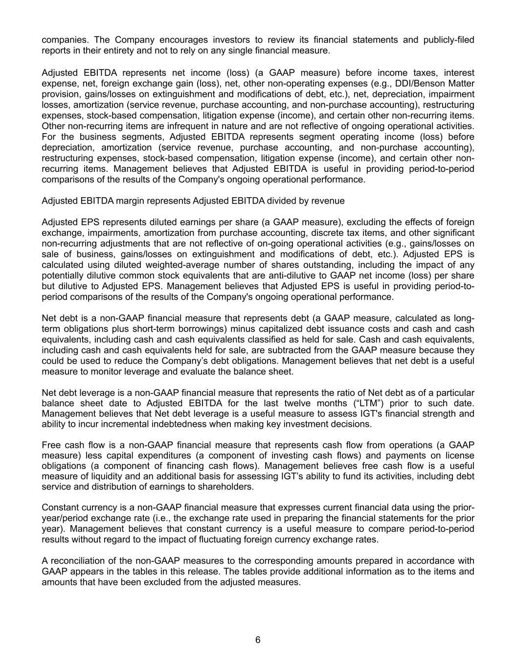 companies. The Company encourages investors to review its financial statements and publicly-filed reports in their entirety and not to rely on any single financial measure. Adjusted EBITDA represents net income (loss) (a GAAP measure) before income taxes, interest expense, net, foreign exchange gain (loss), net, other non-operating expenses (e.g., DDI/Benson Matter provision, gains/losses on extinguishment and modifications of debt, etc.), net, depreciation, impairment losses, amortization (service revenue, purchase accounting, and non-purchase accounting), restructuring expenses, stock-based compensation, litigation expense (income), and certain other non-recurring items. Other non-recurring items are infrequent in nature and are not reflective of ongoing operational activities. For the business segments, Adjusted EBITDA represents segment operating income (loss) before depreciation, amortization (service revenue, purchase accounting, and non-purchase accounting), restructuring expenses, stock-based compensation, litigation expense (income), and certain other non- recurring items. Management believes that Adjusted EBITDA is useful in providing period-to-period comparisons of the results of the Company's ongoing operational performance. Adjusted EBITDA margin represents Adjusted EBITDA divided by revenue Adjusted EPS represents diluted earnings per share (a GAAP measure), excluding the effects of foreign exchange, impairments, amortization from purchase accounting, discrete tax items, and other significant non-recurring adjustments that are not reflective of on-going operational activities (e.g., gains/losses on sale of business, gains/losses on extinguishment and modifications of debt, etc.). Adjusted EPS is calculated using diluted weighted-average number of shares outstanding, including the impact of any potentially dilutive common stock equivalents that are anti-dilutive to GAAP net income (loss) per share but dilutive to Adjusted EPS. Management believes that Adjusted EPS is useful in providing period-to- period comparisons of the results of the Company's ongoing operational performance. Net debt is a non-GAAP financial measure that represents debt (a GAAP measure, calculated as long- term obligations plus short-term borrowings) minus capitalized debt issuance costs and cash and cash equivalents, including cash and cash equivalents classified as held for sale. Cash and cash equivalents, including cash and cash equivalents held for sale, are subtracted from the GAAP measure because they could be used to reduce the Company’s debt obligations. Management believes that net debt is a useful measure to monitor leverage and evaluate the balance sheet. Net debt leverage is a non-GAAP financial measure that represents the ratio of Net debt as of a particular balance sheet date to Adjusted EBITDA for the last twelve months (“LTM”) prior to such date. Management believes that Net debt leverage is a useful measure to assess IGT's financial strength and ability to incur incremental indebtedness when making key investment decisions. Free cash flow is a non-GAAP financial measure that represents cash flow from operations (a GAAP measure) less capital expenditures (a component of investing cash flows) and payments on license obligations (a component of financing cash flows). Management believes free cash flow is a useful measure of liquidity and an additional basis for assessing IGT’s ability to fund its activities, including debt service and distribution of earnings to shareholders. Constant currency is a non-GAAP financial measure that expresses current financial data using the prior- year/period exchange rate (i.e., the exchange rate used in preparing the financial statements for the prior year). Management believes that constant currency is a useful measure to compare period-to-period results without regard to the impact of fluctuating foreign currency exchange rates. A reconciliation of the non-GAAP measures to the corresponding amounts prepared in accordance with GAAP appears in the tables in this release. The tables provide additional information as to the items and amounts that have been excluded from the adjusted measures. 6