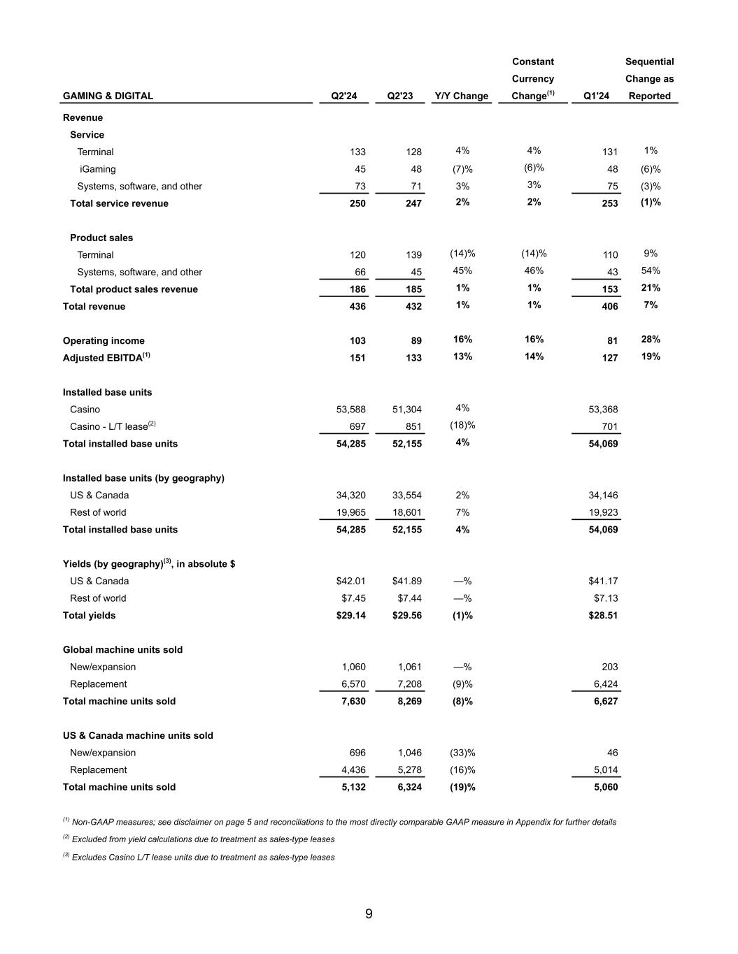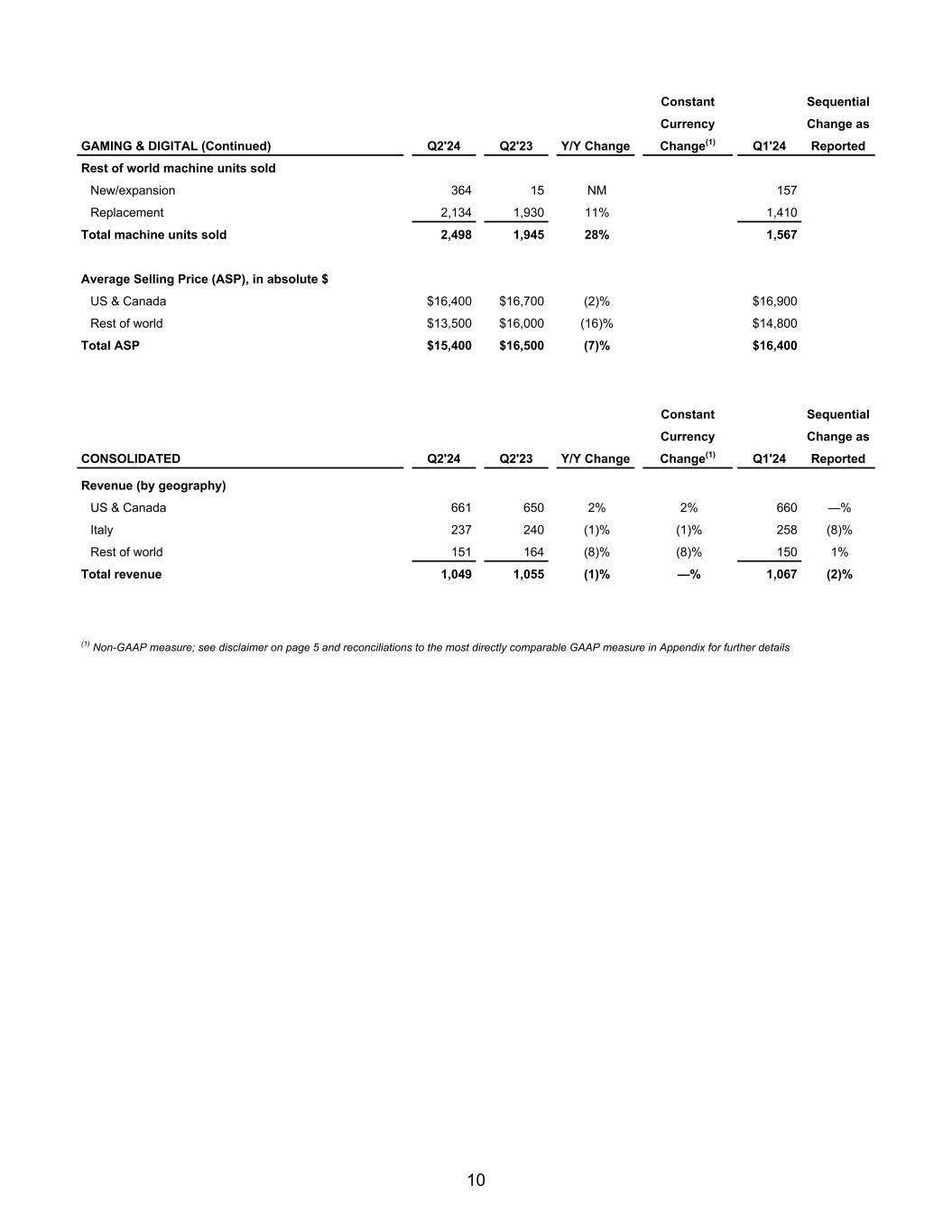 Constant Sequential Q2'24 Q2'23 Currency Change as GAMING & DIGITAL Y/Y Change Change(1) Q1'24 Reported Revenue Service Terminal 133 128 4% 4% 131 1% iGaming 45 48 (7)% (6)% 48 (6)% Systems, software, and other 73 71 3% 3% 75 (3)% Total service revenue 250 247 2% 2% 253 (1)% Product sales Terminal 120 139 (14)% (14)% 110 9% Systems, software, and other 66 45 45% 46% 43 54% Total product sales revenue 186 185 1% 1% 153 21% Total revenue 436 432 1% 1% 406 7% Operating income 103 89 16% 16% 81 28% Adjusted EBITDA(1) 151 133 13% 14% 127 19% Installed base units Casino 53,588 51,304 4% 53,368 Casino - L/T lease(2) 697 851 (18)% 701 Total installed base units 54,285 52,155 4% 54,069 Installed base units (by geography) US & Canada 34,320 33,554 2% 34,146 Rest of world 19,965 18,601 7% 19,923 Total installed base units 54,285 52,155 4% 54,069 Yields (by geography)(3), in absolute $ US & Canada $42.01 $41.89 —% $41.17 Rest of world $7.45 $7.44 —% $7.13 Total yields $29.14 $29.56 (1)% $28.51 Global machine units sold New/expansion 1,060 1,061 —% 203 Replacement 6,570 7,208 (9)% 6,424 Total machine units sold 7,630 8,269 (8)% 6,627 US & Canada machine units sold New/expansion 696 1,046 (33)% 46 Replacement 4,436 5,278 (16)% 5,014 Total machine units sold 5,132 6,324 (19)% 5,060 (1) Non-GAAP measures; see disclaimer on page 5 and reconciliations to the most directly comparable GAAP measure in Appendix for further details (2) Excluded from yield calculations due to treatment as sales-type leases (3) Excludes Casino L/T lease units due to treatment as sales-type leases 9