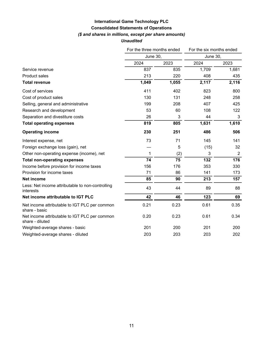 International Game Technology PLC Consolidated Statements of Operations ($ and shares in millions, except per share amounts) Unaudited For the three months ended For the six months ended June 30, June 30, 2024 2023 2024 2023 Service revenue 837 835 1,709 1,681 Product sales 213 220 408 435 Total revenue 1,049 1,055 2,117 2,116 Cost of services 411 402 823 800 Cost of product sales 130 131 248 258 Selling, general and administrative 199 208 407 425 Research and development 53 60 108 122 Separation and divestiture costs 26 3 44 3 Total operating expenses 819 805 1,631 1,610 Operating income 230 251 486 506 Interest expense, net 73 71 145 141 Foreign exchange loss (gain), net — 5 (15) 32 Other non-operating expense (income), net 1 (2) 3 2 Total non-operating expenses 74 75 132 176 Income before provision for income taxes 156 176 353 330 Provision for income taxes 71 86 141 173 Net income 85 90 213 157 Less: Net income attributable to non-controlling interests 43 44 89 88 Net income attributable to IGT PLC 42 46 123 69 Net income attributable to IGT PLC per common share - basic 0.21 0.23 0.61 0.35 Net income attributable to IGT PLC per common share - diluted 0.20 0.23 0.61 0.34 Weighted-average shares - basic 201 200 201 200 Weighted-average shares - diluted 203 203 203 202 11