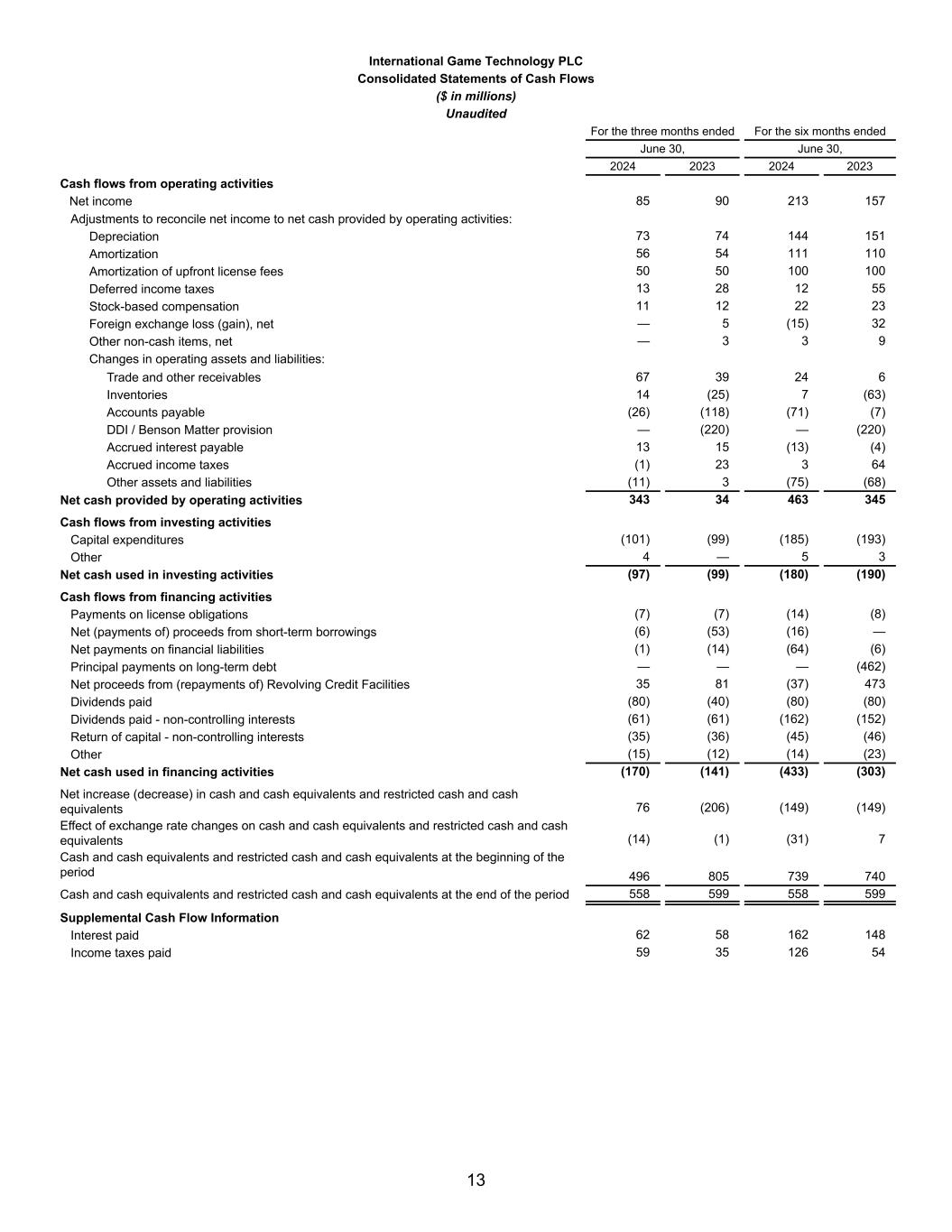 International Game Technology PLC Consolidated Statements of Cash Flows ($ in millions) Unaudited For the three months ended For the six months ended June 30, June 30, 2024 2023 2024 2023 Cash flows from operating activities Net income 85 90 213 157 Adjustments to reconcile net income to net cash provided by operating activities: Depreciation 73 74 144 151 Amortization 56 54 111 110 Amortization of upfront license fees 50 50 100 100 Deferred income taxes 13 28 12 55 Stock-based compensation 11 12 22 23 Foreign exchange loss (gain), net — 5 (15) 32 Other non-cash items, net — 3 3 9 Changes in operating assets and liabilities: Trade and other receivables 67 39 24 6 Inventories 14 (25) 7 (63) Accounts payable (26) (118) (71) (7) DDI / Benson Matter provision — (220) — (220) Accrued interest payable 13 15 (13) (4) Accrued income taxes (1) 23 3 64 Other assets and liabilities (11) 3 (75) (68) Net cash provided by operating activities 343 34 463 345 Cash flows from investing activities Capital expenditures (101) (99) (185) (193) Other 4 — 5 3 Net cash used in investing activities (97) (99) (180) (190) Cash flows from financing activities Payments on license obligations (7) (7) (14) (8) Net (payments of) proceeds from short-term borrowings (6) (53) (16) — Net payments on financial liabilities (1) (14) (64) (6) Principal payments on long-term debt — — — (462) Net proceeds from (repayments of) Revolving Credit Facilities 35 81 (37) 473 Dividends paid (80) (40) (80) (80) Dividends paid - non-controlling interests (61) (61) (162) (152) Return of capital - non-controlling interests (35) (36) (45) (46) Other (15) (12) (14) (23) Net cash used in financing activities (170) (141) (433) (303) Net increase (decrease) in cash and cash equivalents and restricted cash and cash equivalents 76 (206) (149) (149) Effect of exchange rate changes on cash and cash equivalents and restricted cash and cash equivalents (14) (1) (31) 7 Cash and cash equivalents and restricted cash and cash equivalents at the beginning of the period 496 805 739 740 Cash and cash equivalents and restricted cash and cash equivalents at the end of the period 558 599 558 599 Supplemental Cash Flow Information Interest paid 62 58 162 148 Income taxes paid 59 35 126 54 13