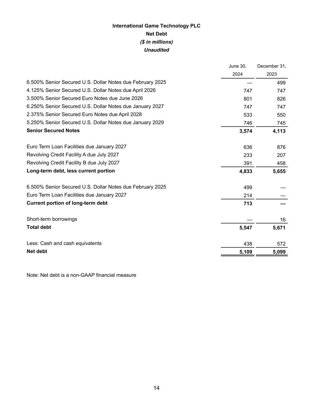 International Game Technology PLC Net Debt ($ in millions) Unaudited June 30, December 31, 2024 2023 6.500% Senior Secured U.S. Dollar Notes due February 2025 — 499 4.125% Senior Secured U.S. Dollar Notes due April 2026 747 747 3.500% Senior Secured Euro Notes due June 2026 801 826 6.250% Senior Secured U.S. Dollar Notes due January 2027 747 747 2.375% Senior Secured Euro Notes due April 2028 533 550 5.250% Senior Secured U.S. Dollar Notes due January 2029 746 745 Senior Secured Notes 3,574 4,113 Euro Term Loan Facilities due January 2027 636 876 Revolving Credit Facility A due July 2027 233 207 Revolving Credit Facility B due July 2027 391 458 Long-term debt, less current portion 4,833 5,655 6.500% Senior Secured U.S. Dollar Notes due February 2025 499 — Euro Term Loan Facilities due January 2027 214 — Current portion of long-term debt 713 — Short-term borrowings — 16 Total debt 5,547 5,671 Less: Cash and cash equivalents 438 572 Net debt 5,109 5,099 Note: Net debt is a non-GAAP financial measure 14