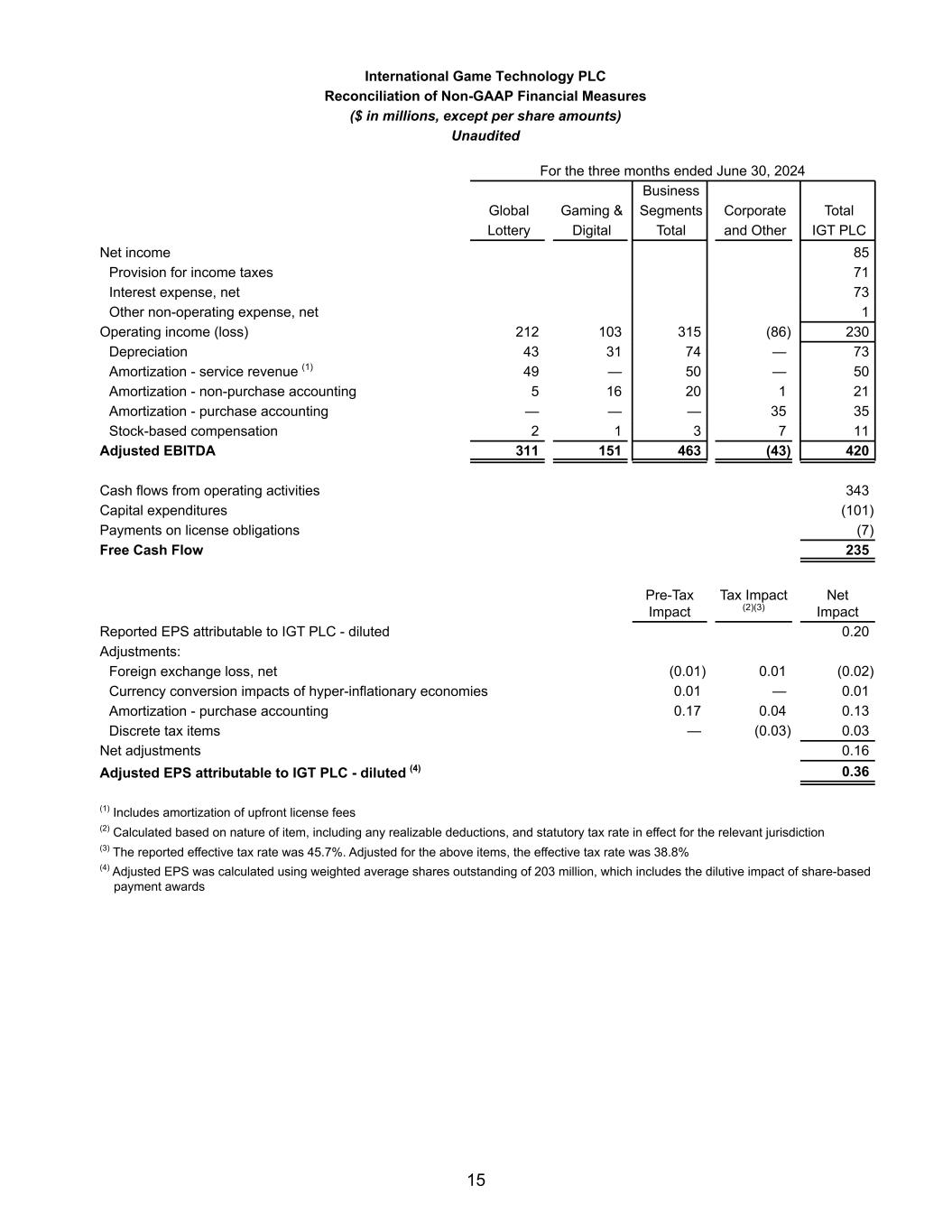 International Game Technology PLC Reconciliation of Non-GAAP Financial Measures ($ in millions, except per share amounts) Unaudited For the three months ended June 30, 2024 Business Global Gaming & Segments Corporate Total Lottery Digital Total and Other IGT PLC Net income 85 Provision for income taxes 71 Interest expense, net 73 Other non-operating expense, net 1 Operating income (loss) 212 103 315 (86) 230 Depreciation 43 31 74 — 73 Amortization - service revenue (1) 49 — 50 — 50 Amortization - non-purchase accounting 5 16 20 1 21 Amortization - purchase accounting — — — 35 35 Stock-based compensation 2 1 3 7 11 Adjusted EBITDA 311 151 463 (43) 420 Cash flows from operating activities 343 Capital expenditures (101) Payments on license obligations (7) Free Cash Flow 235 Pre-Tax Impact Tax Impact (2)(3) Net Impact Reported EPS attributable to IGT PLC - diluted 0.20 Adjustments: Foreign exchange loss, net (0.01) 0.01 (0.02) Currency conversion impacts of hyper-inflationary economies 0.01 — 0.01 Amortization - purchase accounting 0.17 0.04 0.13 Discrete tax items — (0.03) 0.03 Net adjustments 0.16 Adjusted EPS attributable to IGT PLC - diluted (4) 0.36 (1) Includes amortization of upfront license fees (2) Calculated based on nature of item, including any realizable deductions, and statutory tax rate in effect for the relevant jurisdiction (3) The reported effective tax rate was 45.7%. Adjusted for the above items, the effective tax rate was 38.8% (4) Adjusted EPS was calculated using weighted average shares outstanding of 203 million, which includes the dilutive impact of share-based payment awards 15