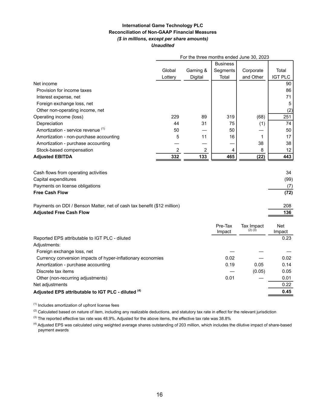 International Game Technology PLC Reconciliation of Non-GAAP Financial Measures ($ in millions, except per share amounts) Unaudited For the three months ended June 30, 2023 Business Global Gaming & Segments Corporate Total Lottery Digital Total and Other IGT PLC Net income 90 Provision for income taxes 86 Interest expense, net 71 Foreign exchange loss, net 5 Other non-operating income, net (2) Operating income (loss) 229 89 319 (68) 251 Depreciation 44 31 75 (1) 74 Amortization - service revenue (1) 50 — 50 — 50 Amortization - non-purchase accounting 5 11 16 1 17 Amortization - purchase accounting — — — 38 38 Stock-based compensation 2 2 4 8 12 Adjusted EBITDA 332 133 465 (22) 443 Cash flows from operating activities 34 Capital expenditures (99) Payments on license obligations (7) Free Cash Flow (72) Payments on DDI / Benson Matter, net of cash tax benefit ($12 million) 208 Adjusted Free Cash Flow 136 Pre-Tax Impact Tax Impact (2) (3) Net Impact Reported EPS attributable to IGT PLC - diluted 0.23 Adjustments: Foreign exchange loss, net — — — Currency conversion impacts of hyper-inflationary economies 0.02 — 0.02 Amortization - purchase accounting 0.19 0.05 0.14 Discrete tax items — (0.05) 0.05 Other (non-recurring adjustments) 0.01 — 0.01 Net adjustments 0.22 Adjusted EPS attributable to IGT PLC - diluted (4) 0.45 (1) Includes amortization of upfront license fees (2) Calculated based on nature of item, including any realizable deductions, and statutory tax rate in effect for the relevant jurisdiction (3) The reported effective tax rate was 48.9%. Adjusted for the above items, the effective tax rate was 38.8% (4) Adjusted EPS was calculated using weighted average shares outstanding of 203 million, which includes the dilutive impact of share-based payment awards 16