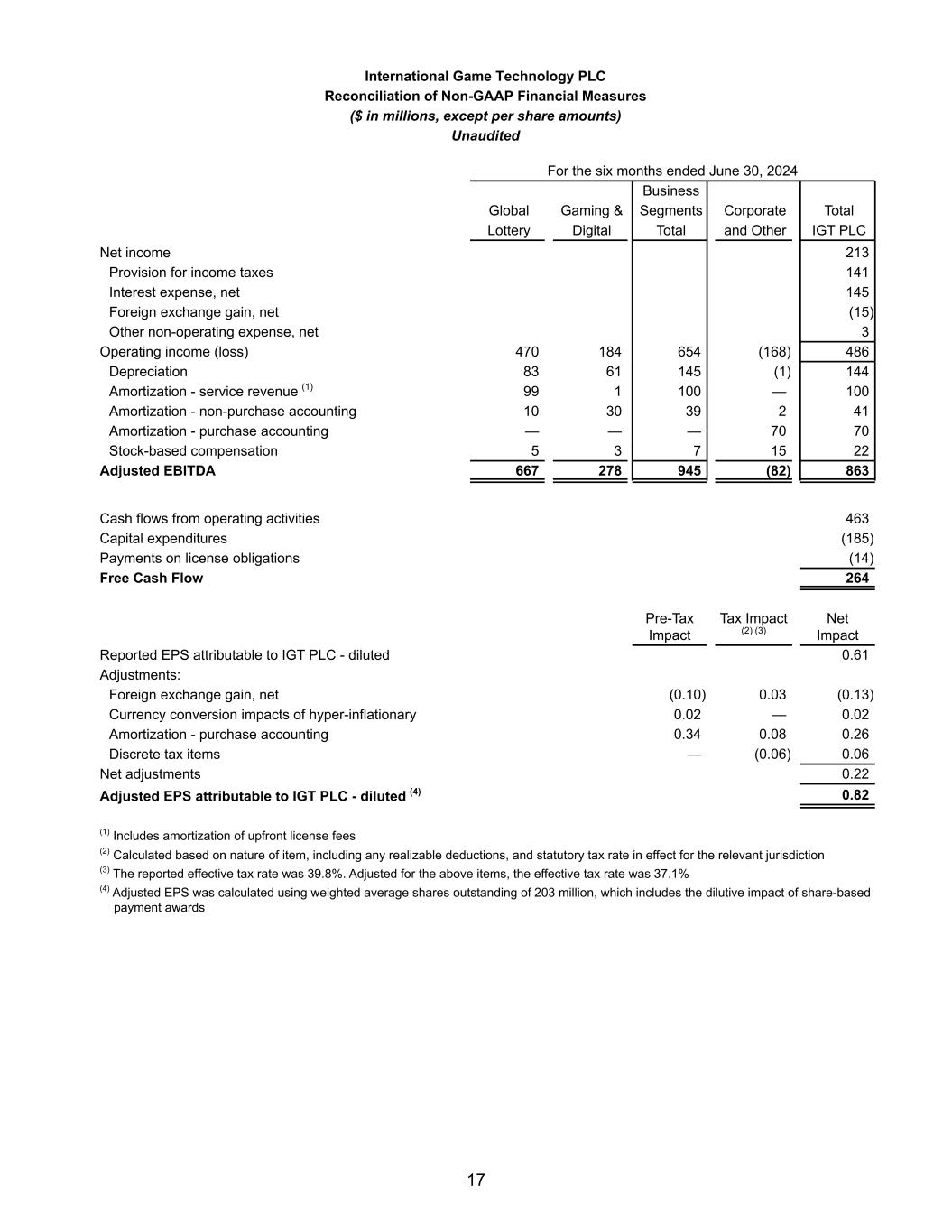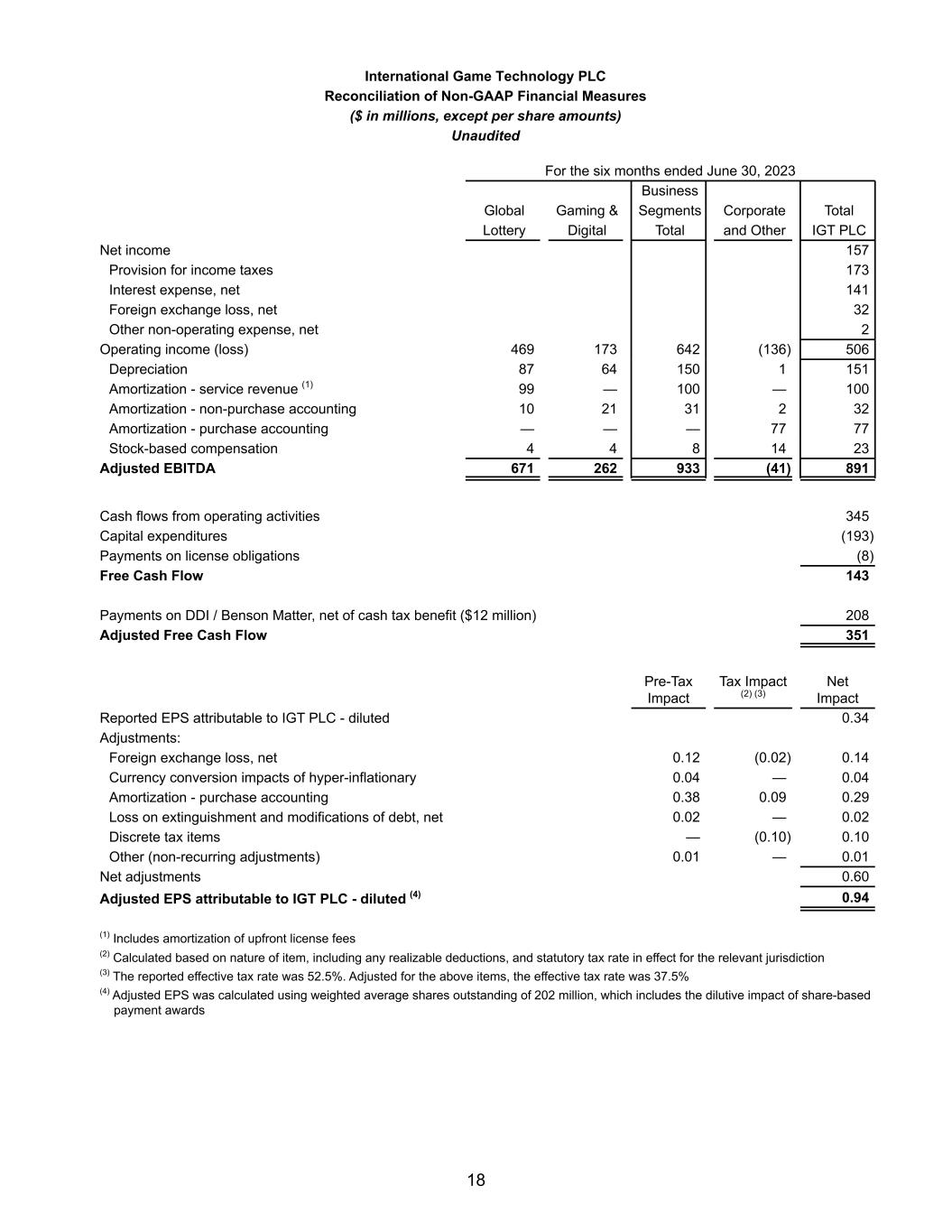 International Game Technology PLC Reconciliation of Non-GAAP Financial Measures ($ in millions, except per share amounts) Unaudited For the six months ended June 30, 2024 Business Global Gaming & Segments Corporate Total Lottery Digital Total and Other IGT PLC Net income 213 Provision for income taxes 141 Interest expense, net 145 Foreign exchange gain, net (15) Other non-operating expense, net 3 Operating income (loss) 470 184 654 (168) 486 Depreciation 83 61 145 (1) 144 Amortization - service revenue (1) 99 1 100 — 100 Amortization - non-purchase accounting 10 30 39 2 41 Amortization - purchase accounting — — — 70 70 Stock-based compensation 5 3 7 15 22 Adjusted EBITDA 667 278 945 (82) 863 Cash flows from operating activities 463 Capital expenditures (185) Payments on license obligations (14) Free Cash Flow 264 Pre-Tax Impact Tax Impact (2) (3) Net Impact Reported EPS attributable to IGT PLC - diluted 0.61 Adjustments: Foreign exchange gain, net (0.10) 0.03 (0.13) Currency conversion impacts of hyper-inflationary 0.02 — 0.02 Amortization - purchase accounting 0.34 0.08 0.26 Discrete tax items — (0.06) 0.06 Net adjustments 0.22 Adjusted EPS attributable to IGT PLC - diluted (4) 0.82 (1) Includes amortization of upfront license fees (2) Calculated based on nature of item, including any realizable deductions, and statutory tax rate in effect for the relevant jurisdiction (3) The reported effective tax rate was 39.8%. Adjusted for the above items, the effective tax rate was 37.1% (4) Adjusted EPS was calculated using weighted average shares outstanding of 203 million, which includes the dilutive impact of share-based payment awards 17