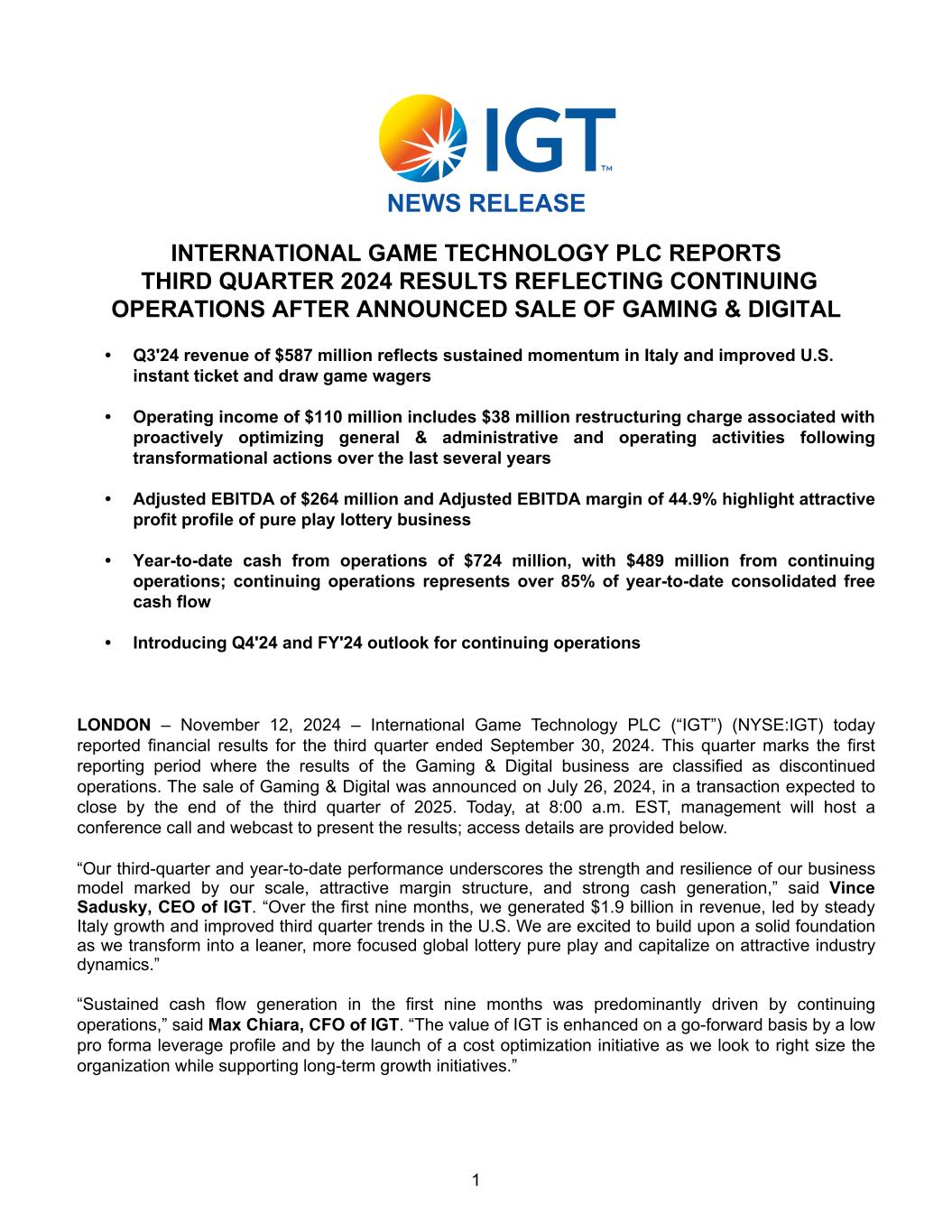 NEWS RELEASE INTERNATIONAL GAME TECHNOLOGY PLC REPORTS THIRD QUARTER 2024 RESULTS REFLECTING CONTINUING OPERATIONS AFTER ANNOUNCED SALE OF GAMING & DIGITAL • Q3'24 revenue of $587 million reflects sustained momentum in Italy and improved U.S. instant ticket and draw game wagers • Operating income of $110 million includes $38 million restructuring charge associated with proactively optimizing general & administrative and operating activities following transformational actions over the last several years • Adjusted EBITDA of $264 million and Adjusted EBITDA margin of 44.9% highlight attractive profit profile of pure play lottery business • Year-to-date cash from operations of $724 million, with $489 million from continuing operations; continuing operations represents over 85% of year-to-date consolidated free cash flow • Introducing Q4'24 and FY'24 outlook for continuing operations LONDON – November 12, 2024 – International Game Technology PLC (“IGT”) (NYSE:IGT) today reported financial results for the third quarter ended September 30, 2024. This quarter marks the first reporting period where the results of the Gaming & Digital business are classified as discontinued operations. The sale of Gaming & Digital was announced on July 26, 2024, in a transaction expected to close by the end of the third quarter of 2025. Today, at 8:00 a.m. EST, management will host a conference call and webcast to present the results; access details are provided below. “Our third-quarter and year-to-date performance underscores the strength and resilience of our business model marked by our scale, attractive margin structure, and strong cash generation,” said Vince Sadusky, CEO of IGT. “Over the first nine months, we generated $1.9 billion in revenue, led by steady Italy growth and improved third quarter trends in the U.S. We are excited to build upon a solid foundation as we transform into a leaner, more focused global lottery pure play and capitalize on attractive industry dynamics.” “Sustained cash flow generation in the first nine months was predominantly driven by continuing operations,” said Max Chiara, CFO of IGT. “The value of IGT is enhanced on a go-forward basis by a low pro forma leverage profile and by the launch of a cost optimization initiative as we look to right size the organization while supporting long-term growth initiatives.” 1