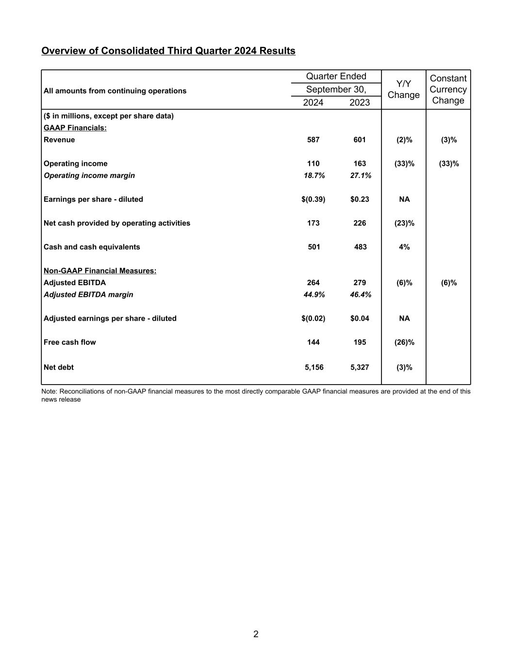 Overview of Consolidated Third Quarter 2024 Results Quarter Ended Y/Y Change Constant Currency Change All amounts from continuing operations September 30, 2024 2023 ($ in millions, except per share data) GAAP Financials: Revenue 587 601 (2)% (3)% Operating income 110 163 (33)% (33)% Operating income margin 18.7% 27.1% Earnings per share - diluted $(0.39) $0.23 NA Net cash provided by operating activities 173 226 (23)% Cash and cash equivalents 501 483 4% Non-GAAP Financial Measures: Adjusted EBITDA 264 279 (6)% (6)% Adjusted EBITDA margin 44.9% 46.4% Adjusted earnings per share - diluted $(0.02) $0.04 NA Free cash flow 144 195 (26)% Net debt 5,156 5,327 (3)% Note: Reconciliations of non-GAAP financial measures to the most directly comparable GAAP financial measures are provided at the end of this news release 2