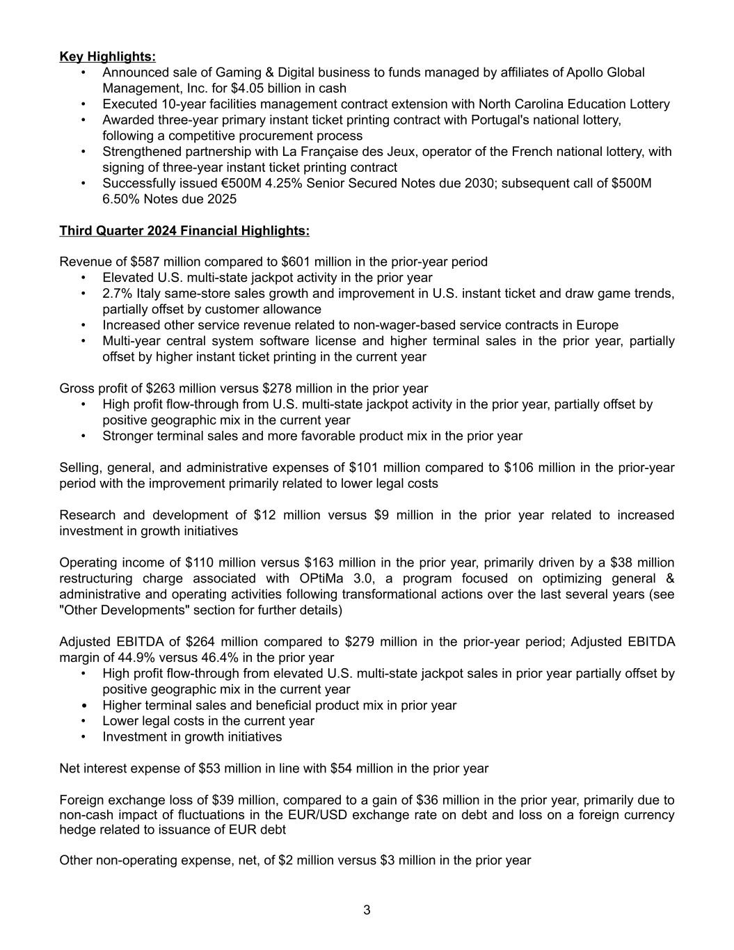 Key Highlights: • Announced sale of Gaming & Digital business to funds managed by affiliates of Apollo Global Management, Inc. for $4.05 billion in cash • Executed 10-year facilities management contract extension with North Carolina Education Lottery • Awarded three-year primary instant ticket printing contract with Portugal's national lottery, following a competitive procurement process • Strengthened partnership with La Française des Jeux, operator of the French national lottery, with signing of three-year instant ticket printing contract • Successfully issued €500M 4.25% Senior Secured Notes due 2030; subsequent call of $500M 6.50% Notes due 2025 Third Quarter 2024 Financial Highlights: Revenue of $587 million compared to $601 million in the prior-year period • Elevated U.S. multi-state jackpot activity in the prior year • 2.7% Italy same-store sales growth and improvement in U.S. instant ticket and draw game trends, partially offset by customer allowance • Increased other service revenue related to non-wager-based service contracts in Europe • Multi-year central system software license and higher terminal sales in the prior year, partially offset by higher instant ticket printing in the current year Gross profit of $263 million versus $278 million in the prior year • High profit flow-through from U.S. multi-state jackpot activity in the prior year, partially offset by positive geographic mix in the current year • Stronger terminal sales and more favorable product mix in the prior year Selling, general, and administrative expenses of $101 million compared to $106 million in the prior-year period with the improvement primarily related to lower legal costs Research and development of $12 million versus $9 million in the prior year related to increased investment in growth initiatives Operating income of $110 million versus $163 million in the prior year, primarily driven by a $38 million restructuring charge associated with OPtiMa 3.0, a program focused on optimizing general & administrative and operating activities following transformational actions over the last several years (see "Other Developments" section for further details) Adjusted EBITDA of $264 million compared to $279 million in the prior-year period; Adjusted EBITDA margin of 44.9% versus 46.4% in the prior year • High profit flow-through from elevated U.S. multi-state jackpot sales in prior year partially offset by positive geographic mix in the current year • Higher terminal sales and beneficial product mix in prior year • Lower legal costs in the current year • Investment in growth initiatives Net interest expense of $53 million in line with $54 million in the prior year Foreign exchange loss of $39 million, compared to a gain of $36 million in the prior year, primarily due to non-cash impact of fluctuations in the EUR/USD exchange rate on debt and loss on a foreign currency hedge related to issuance of EUR debt Other non-operating expense, net, of $2 million versus $3 million in the prior year 3