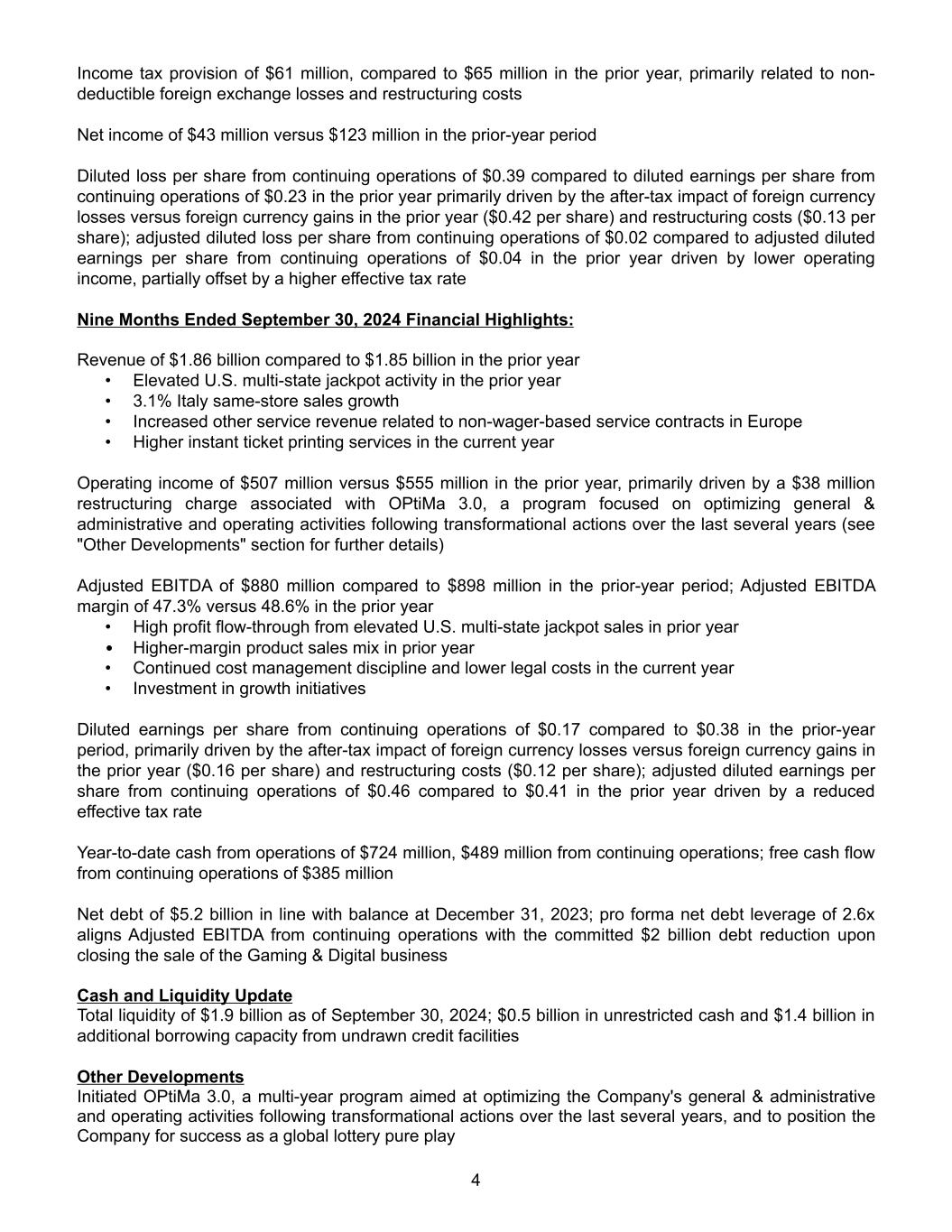Income tax provision of $61 million, compared to $65 million in the prior year, primarily related to non- deductible foreign exchange losses and restructuring costs Net income of $43 million versus $123 million in the prior-year period Diluted loss per share from continuing operations of $0.39 compared to diluted earnings per share from continuing operations of $0.23 in the prior year primarily driven by the after-tax impact of foreign currency losses versus foreign currency gains in the prior year ($0.42 per share) and restructuring costs ($0.13 per share); adjusted diluted loss per share from continuing operations of $0.02 compared to adjusted diluted earnings per share from continuing operations of $0.04 in the prior year driven by lower operating income, partially offset by a higher effective tax rate Nine Months Ended September 30, 2024 Financial Highlights: Revenue of $1.86 billion compared to $1.85 billion in the prior year • Elevated U.S. multi-state jackpot activity in the prior year • 3.1% Italy same-store sales growth • Increased other service revenue related to non-wager-based service contracts in Europe • Higher instant ticket printing services in the current year Operating income of $507 million versus $555 million in the prior year, primarily driven by a $38 million restructuring charge associated with OPtiMa 3.0, a program focused on optimizing general & administrative and operating activities following transformational actions over the last several years (see "Other Developments" section for further details) Adjusted EBITDA of $880 million compared to $898 million in the prior-year period; Adjusted EBITDA margin of 47.3% versus 48.6% in the prior year • High profit flow-through from elevated U.S. multi-state jackpot sales in prior year • Higher-margin product sales mix in prior year • Continued cost management discipline and lower legal costs in the current year • Investment in growth initiatives Diluted earnings per share from continuing operations of $0.17 compared to $0.38 in the prior-year period, primarily driven by the after-tax impact of foreign currency losses versus foreign currency gains in the prior year ($0.16 per share) and restructuring costs ($0.12 per share); adjusted diluted earnings per share from continuing operations of $0.46 compared to $0.41 in the prior year driven by a reduced effective tax rate Year-to-date cash from operations of $724 million, $489 million from continuing operations; free cash flow from continuing operations of $385 million Net debt of $5.2 billion in line with balance at December 31, 2023; pro forma net debt leverage of 2.6x aligns Adjusted EBITDA from continuing operations with the committed $2 billion debt reduction upon closing the sale of the Gaming & Digital business Cash and Liquidity Update Total liquidity of $1.9 billion as of September 30, 2024; $0.5 billion in unrestricted cash and $1.4 billion in additional borrowing capacity from undrawn credit facilities Other Developments Initiated OPtiMa 3.0, a multi-year program aimed at optimizing the Company's general & administrative and operating activities following transformational actions over the last several years, and to position the Company for success as a global lottery pure play 4