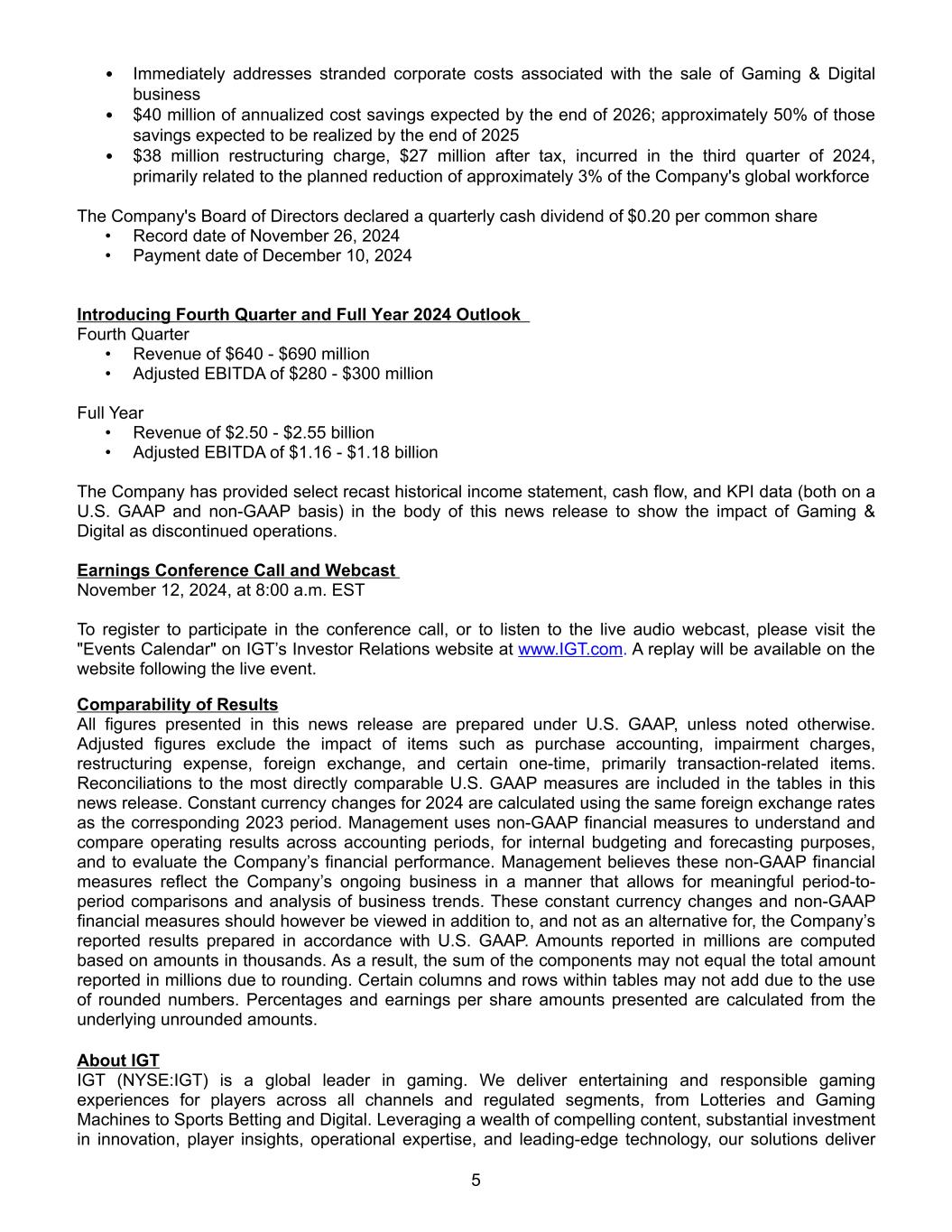 • Immediately addresses stranded corporate costs associated with the sale of Gaming & Digital business • $40 million of annualized cost savings expected by the end of 2026; approximately 50% of those savings expected to be realized by the end of 2025 • $38 million restructuring charge, $27 million after tax, incurred in the third quarter of 2024, primarily related to the planned reduction of approximately 3% of the Company's global workforce The Company's Board of Directors declared a quarterly cash dividend of $0.20 per common share • Record date of November 26, 2024 • Payment date of December 10, 2024 Introducing Fourth Quarter and Full Year 2024 Outlook Fourth Quarter • Revenue of $640 - $690 million • Adjusted EBITDA of $280 - $300 million Full Year • Revenue of $2.50 - $2.55 billion • Adjusted EBITDA of $1.16 - $1.18 billion The Company has provided select recast historical income statement, cash flow, and KPI data (both on a U.S. GAAP and non-GAAP basis) in the body of this news release to show the impact of Gaming & Digital as discontinued operations. Earnings Conference Call and Webcast November 12, 2024, at 8:00 a.m. EST To register to participate in the conference call, or to listen to the live audio webcast, please visit the "Events Calendar" on IGT’s Investor Relations website at www.IGT.com. A replay will be available on the website following the live event. Comparability of Results All figures presented in this news release are prepared under U.S. GAAP, unless noted otherwise. Adjusted figures exclude the impact of items such as purchase accounting, impairment charges, restructuring expense, foreign exchange, and certain one-time, primarily transaction-related items. Reconciliations to the most directly comparable U.S. GAAP measures are included in the tables in this news release. Constant currency changes for 2024 are calculated using the same foreign exchange rates as the corresponding 2023 period. Management uses non-GAAP financial measures to understand and compare operating results across accounting periods, for internal budgeting and forecasting purposes, and to evaluate the Company’s financial performance. Management believes these non-GAAP financial measures reflect the Company’s ongoing business in a manner that allows for meaningful period-to- period comparisons and analysis of business trends. These constant currency changes and non-GAAP financial measures should however be viewed in addition to, and not as an alternative for, the Company’s reported results prepared in accordance with U.S. GAAP. Amounts reported in millions are computed based on amounts in thousands. As a result, the sum of the components may not equal the total amount reported in millions due to rounding. Certain columns and rows within tables may not add due to the use of rounded numbers. Percentages and earnings per share amounts presented are calculated from the underlying unrounded amounts. About IGT IGT (NYSE:IGT) is a global leader in gaming. We deliver entertaining and responsible gaming experiences for players across all channels and regulated segments, from Lotteries and Gaming Machines to Sports Betting and Digital. Leveraging a wealth of compelling content, substantial investment in innovation, player insights, operational expertise, and leading-edge technology, our solutions deliver 5