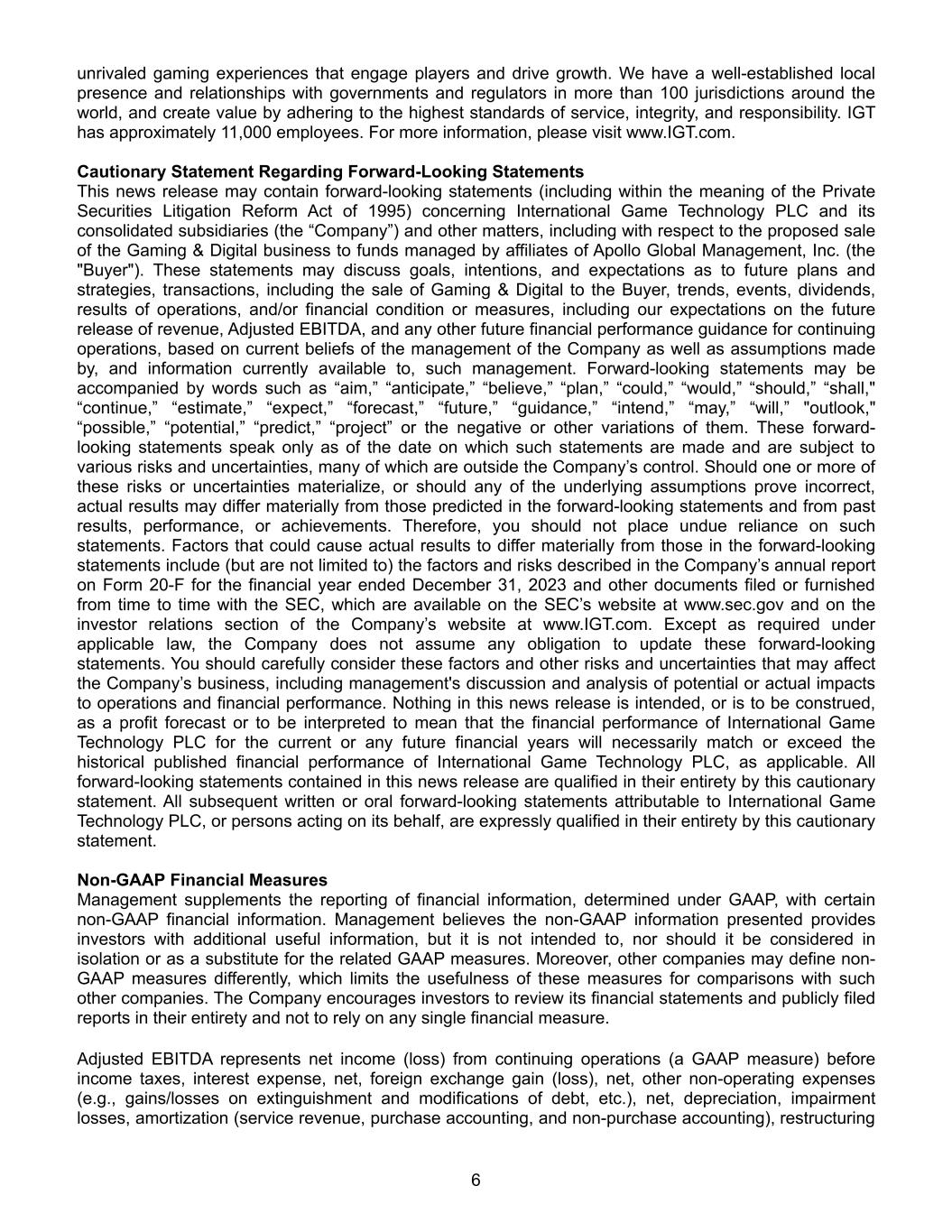 unrivaled gaming experiences that engage players and drive growth. We have a well-established local presence and relationships with governments and regulators in more than 100 jurisdictions around the world, and create value by adhering to the highest standards of service, integrity, and responsibility. IGT has approximately 11,000 employees. For more information, please visit www.IGT.com. Cautionary Statement Regarding Forward-Looking Statements This news release may contain forward-looking statements (including within the meaning of the Private Securities Litigation Reform Act of 1995) concerning International Game Technology PLC and its consolidated subsidiaries (the “Company”) and other matters, including with respect to the proposed sale of the Gaming & Digital business to funds managed by affiliates of Apollo Global Management, Inc. (the "Buyer"). These statements may discuss goals, intentions, and expectations as to future plans and strategies, transactions, including the sale of Gaming & Digital to the Buyer, trends, events, dividends, results of operations, and/or financial condition or measures, including our expectations on the future release of revenue, Adjusted EBITDA, and any other future financial performance guidance for continuing operations, based on current beliefs of the management of the Company as well as assumptions made by, and information currently available to, such management. Forward-looking statements may be accompanied by words such as “aim,” “anticipate,” “believe,” “plan,” “could,” “would,” “should,” “shall," “continue,” “estimate,” “expect,” “forecast,” “future,” “guidance,” “intend,” “may,” “will,” "outlook," “possible,” “potential,” “predict,” “project” or the negative or other variations of them. These forward- looking statements speak only as of the date on which such statements are made and are subject to various risks and uncertainties, many of which are outside the Company’s control. Should one or more of these risks or uncertainties materialize, or should any of the underlying assumptions prove incorrect, actual results may differ materially from those predicted in the forward-looking statements and from past results, performance, or achievements. Therefore, you should not place undue reliance on such statements. Factors that could cause actual results to differ materially from those in the forward-looking statements include (but are not limited to) the factors and risks described in the Company’s annual report on Form 20-F for the financial year ended December 31, 2023 and other documents filed or furnished from time to time with the SEC, which are available on the SEC’s website at www.sec.gov and on the investor relations section of the Company’s website at www.IGT.com. Except as required under applicable law, the Company does not assume any obligation to update these forward-looking statements. You should carefully consider these factors and other risks and uncertainties that may affect the Company’s business, including management's discussion and analysis of potential or actual impacts to operations and financial performance. Nothing in this news release is intended, or is to be construed, as a profit forecast or to be interpreted to mean that the financial performance of International Game Technology PLC for the current or any future financial years will necessarily match or exceed the historical published financial performance of International Game Technology PLC, as applicable. All forward-looking statements contained in this news release are qualified in their entirety by this cautionary statement. All subsequent written or oral forward-looking statements attributable to International Game Technology PLC, or persons acting on its behalf, are expressly qualified in their entirety by this cautionary statement. Non-GAAP Financial Measures Management supplements the reporting of financial information, determined under GAAP, with certain non-GAAP financial information. Management believes the non-GAAP information presented provides investors with additional useful information, but it is not intended to, nor should it be considered in isolation or as a substitute for the related GAAP measures. Moreover, other companies may define non- GAAP measures differently, which limits the usefulness of these measures for comparisons with such other companies. The Company encourages investors to review its financial statements and publicly filed reports in their entirety and not to rely on any single financial measure. Adjusted EBITDA represents net income (loss) from continuing operations (a GAAP measure) before income taxes, interest expense, net, foreign exchange gain (loss), net, other non-operating expenses (e.g., gains/losses on extinguishment and modifications of debt, etc.), net, depreciation, impairment losses, amortization (service revenue, purchase accounting, and non-purchase accounting), restructuring 6