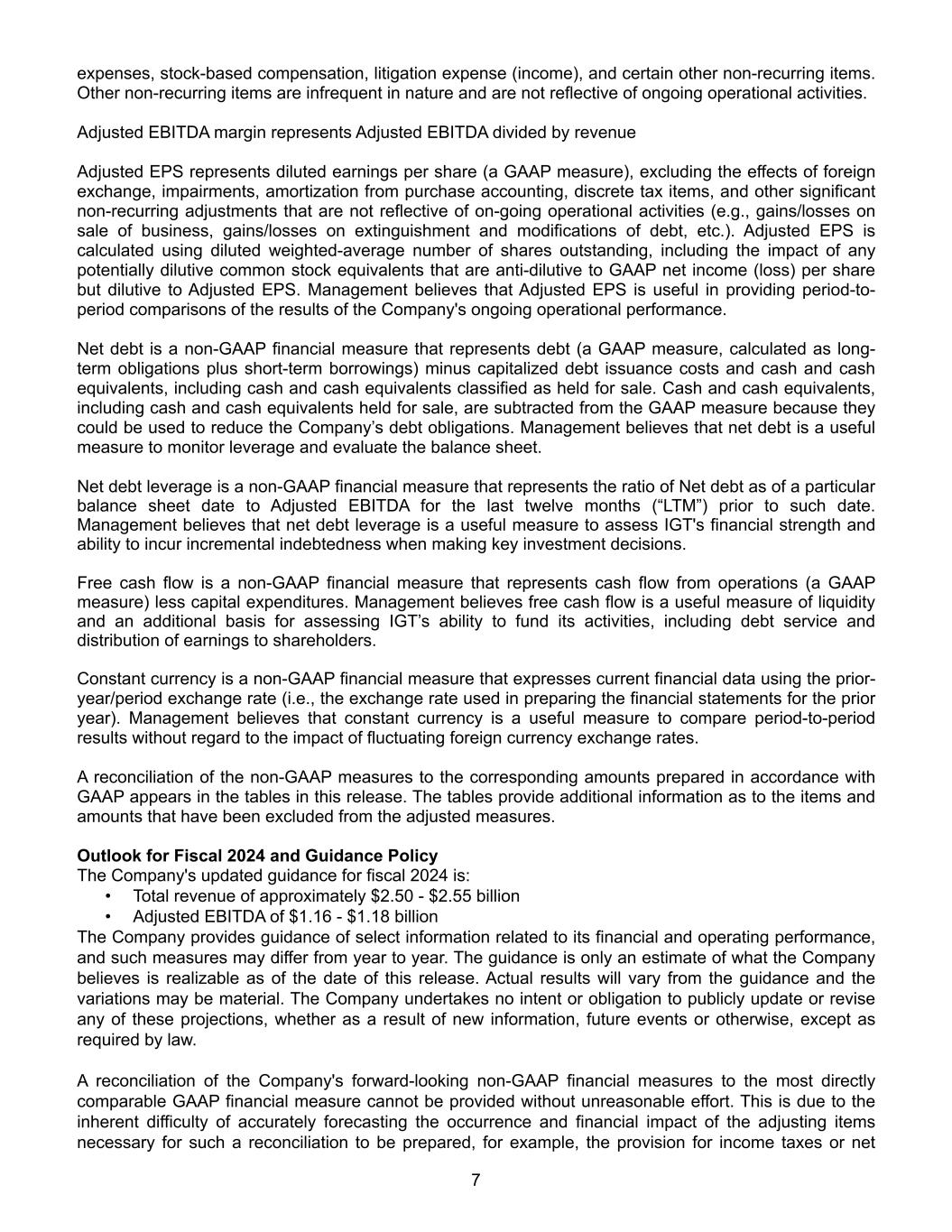 expenses, stock-based compensation, litigation expense (income), and certain other non-recurring items. Other non-recurring items are infrequent in nature and are not reflective of ongoing operational activities. Adjusted EBITDA margin represents Adjusted EBITDA divided by revenue Adjusted EPS represents diluted earnings per share (a GAAP measure), excluding the effects of foreign exchange, impairments, amortization from purchase accounting, discrete tax items, and other significant non-recurring adjustments that are not reflective of on-going operational activities (e.g., gains/losses on sale of business, gains/losses on extinguishment and modifications of debt, etc.). Adjusted EPS is calculated using diluted weighted-average number of shares outstanding, including the impact of any potentially dilutive common stock equivalents that are anti-dilutive to GAAP net income (loss) per share but dilutive to Adjusted EPS. Management believes that Adjusted EPS is useful in providing period-to- period comparisons of the results of the Company's ongoing operational performance. Net debt is a non-GAAP financial measure that represents debt (a GAAP measure, calculated as long- term obligations plus short-term borrowings) minus capitalized debt issuance costs and cash and cash equivalents, including cash and cash equivalents classified as held for sale. Cash and cash equivalents, including cash and cash equivalents held for sale, are subtracted from the GAAP measure because they could be used to reduce the Company’s debt obligations. Management believes that net debt is a useful measure to monitor leverage and evaluate the balance sheet. Net debt leverage is a non-GAAP financial measure that represents the ratio of Net debt as of a particular balance sheet date to Adjusted EBITDA for the last twelve months (“LTM”) prior to such date. Management believes that net debt leverage is a useful measure to assess IGT's financial strength and ability to incur incremental indebtedness when making key investment decisions. Free cash flow is a non-GAAP financial measure that represents cash flow from operations (a GAAP measure) less capital expenditures. Management believes free cash flow is a useful measure of liquidity and an additional basis for assessing IGT’s ability to fund its activities, including debt service and distribution of earnings to shareholders. Constant currency is a non-GAAP financial measure that expresses current financial data using the prior- year/period exchange rate (i.e., the exchange rate used in preparing the financial statements for the prior year). Management believes that constant currency is a useful measure to compare period-to-period results without regard to the impact of fluctuating foreign currency exchange rates. A reconciliation of the non-GAAP measures to the corresponding amounts prepared in accordance with GAAP appears in the tables in this release. The tables provide additional information as to the items and amounts that have been excluded from the adjusted measures. Outlook for Fiscal 2024 and Guidance Policy The Company's updated guidance for fiscal 2024 is: • Total revenue of approximately $2.50 - $2.55 billion • Adjusted EBITDA of $1.16 - $1.18 billion The Company provides guidance of select information related to its financial and operating performance, and such measures may differ from year to year. The guidance is only an estimate of what the Company believes is realizable as of the date of this release. Actual results will vary from the guidance and the variations may be material. The Company undertakes no intent or obligation to publicly update or revise any of these projections, whether as a result of new information, future events or otherwise, except as required by law. A reconciliation of the Company's forward-looking non-GAAP financial measures to the most directly comparable GAAP financial measure cannot be provided without unreasonable effort. This is due to the inherent difficulty of accurately forecasting the occurrence and financial impact of the adjusting items necessary for such a reconciliation to be prepared, for example, the provision for income taxes or net 7