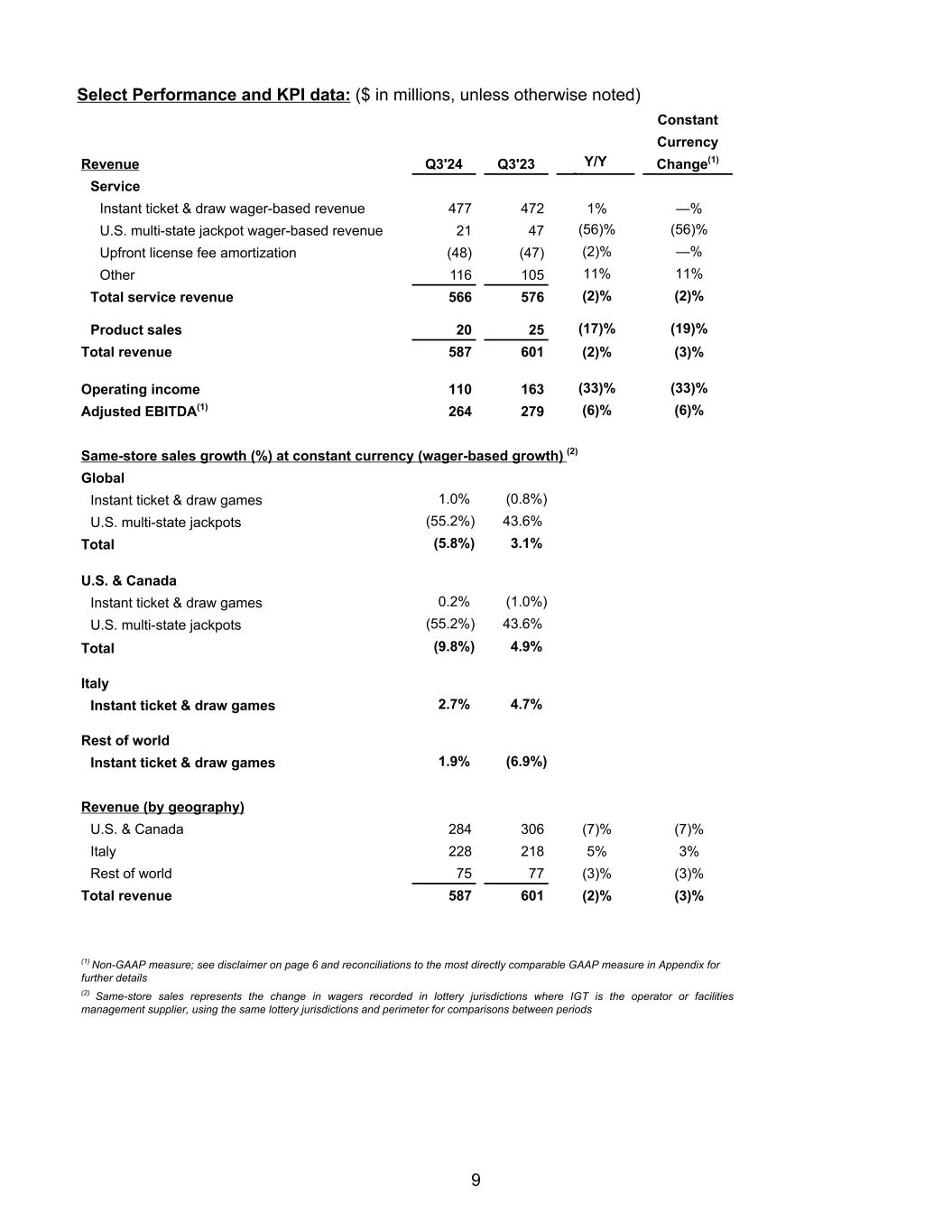 Select Performance and KPI data: ($ in millions, unless otherwise noted) For the three months ended For the three months ended For the year ended 2024 2023 2022 June 30, March 31, December 31, September 30, June 30, March 31, December 31, Revenue Service Instant ticket & draw wager-based revenue 487 514 500 472 485 501 1,846 U.S. multi-state jackpot wager-based revenue 23 31 33 47 18 31 115 Upfront license fee amortization (47) (47) (47) (47) (47) (47) (183) Other 124 121 107 105 131 117 662 Total service revenue 586 619 592 576 588 602 2,440 Product Sales 27 42 89 25 35 22 157 Total revenue 613 661 681 601 623 624 2,597 Same-store sales growth (%) at constant currency (wager-based growth) (1) Global Instant ticket & draw games (0.2) % (0.2) % (0.1) % (0.8) % 2.0 % 5.0 % (3.7) % U.S. multi-state jackpots 22.5 % (0.8) % (28.7) % 43.6 % (2.1) % 62.3 % 21.0 % Total 0.9 % (0.3) % (3.5) % 3.1 % 1.8 % 8.0 % (2.2) % U.S. & Canada Instant ticket & draw games (1.9) % (2.6) % (0.9) % (1.0) % 0.4 % 3.4 % (3.0) % U.S. multi-state jackpots 22.5 % (0.8) % (28.7) % 43.6 % (2.1) % 62.3 % 21.0 % Total — % (2.4) % (5.8) % 4.9 % 0.2 % 8.3 % (0.7) % Italy Instant ticket & draw games 2.3 % 4.4 % 2.9 % 4.7 % 8.0 % 10.3 % (8.5) % Rest of world Instant ticket & draw games 3.0 % 2.6 % (1.1) % (6.9) % 0.3 % 3.6 % 0.6 % (1) Same-store sales represents the change in wagers recorded in lottery jurisdictions where IGT is the operator or facilities management supplier, using the same lottery jurisdictions and perimeter for comparisons between periods 18