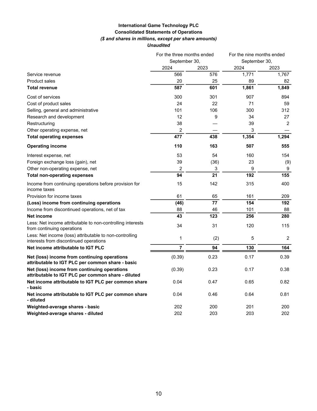 International Game Technology PLC Consolidated Statements of Operations ($ and shares in millions, except per share amounts) Unaudited For the three months ended For the nine months ended September 30, September 30, 2024 2023 2024 2023 Service revenue 566 576 1,771 1,767 Product sales 20 25 89 82 Total revenue 587 601 1,861 1,849 Cost of services 300 301 907 894 Cost of product sales 24 22 71 59 Selling, general and administrative 101 106 300 312 Research and development 12 9 34 27 Restructuring 38 — 39 2 Other operating expense, net 2 — 3 — Total operating expenses 477 438 1,354 1,294 Operating income 110 163 507 555 Interest expense, net 53 54 160 154 Foreign exchange loss (gain), net 39 (36) 23 (9) Other non-operating expense, net 2 3 9 9 Total non-operating expenses 94 21 192 155 Income from continuing operations before provision for income taxes 15 142 315 400 Provision for income taxes 61 65 161 209 (Loss) income from continuing operations (46) 77 154 192 Income from discontinued operations, net of tax 88 46 101 88 Net income 43 123 256 280 Less: Net income attributable to non-controlling interests from continuing operations 34 31 120 115 Less: Net income (loss) attributable to non-controlling interests from discontinued operations 1 (2) 5 2 Net income attributable to IGT PLC 7 94 130 164 Net (loss) income from continuing operations attributable to IGT PLC per common share - basic (0.39) 0.23 0.17 0.39 Net (loss) income from continuing operations attributable to IGT PLC per common share - diluted (0.39) 0.23 0.17 0.38 Net income attributable to IGT PLC per common share - basic 0.04 0.47 0.65 0.82 Net income attributable to IGT PLC per common share - diluted 0.04 0.46 0.64 0.81 Weighted-average shares - basic 202 200 201 200 Weighted-average shares - diluted 202 203 203 202 10