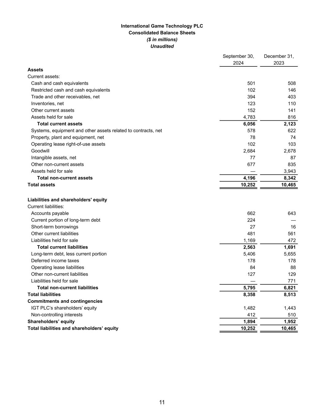 International Game Technology PLC Consolidated Balance Sheets ($ in millions) Unaudited September 30, December 31, 2024 2023 Assets Current assets: Cash and cash equivalents 501 508 Restricted cash and cash equivalents 102 146 Trade and other receivables, net 394 403 Inventories, net 123 110 Other current assets 152 141 Assets held for sale 4,783 816 Total current assets 6,056 2,123 Systems, equipment and other assets related to contracts, net 578 622 Property, plant and equipment, net 78 74 Operating lease right-of-use assets 102 103 Goodwill 2,684 2,678 Intangible assets, net 77 87 Other non-current assets 677 835 Assets held for sale — 3,943 Total non-current assets 4,196 8,342 Total assets 10,252 10,465 Liabilities and shareholders' equity Current liabilities: Accounts payable 662 643 Current portion of long-term debt 224 — Short-term borrowings 27 16 Other current liabilities 481 561 Liabilities held for sale 1,169 472 Total current liabilities 2,563 1,691 Long-term debt, less current portion 5,406 5,655 Deferred income taxes 178 178 Operating lease liabilities 84 88 Other non-current liabilities 127 129 Liabilities held for sale — 771 Total non-current liabilities 5,795 6,821 Total liabilities 8,358 8,513 Commitments and contingencies IGT PLC’s shareholders’ equity 1,482 1,443 Non-controlling interests 412 510 Shareholders’ equity 1,894 1,952 Total liabilities and shareholders’ equity 10,252 10,465 11