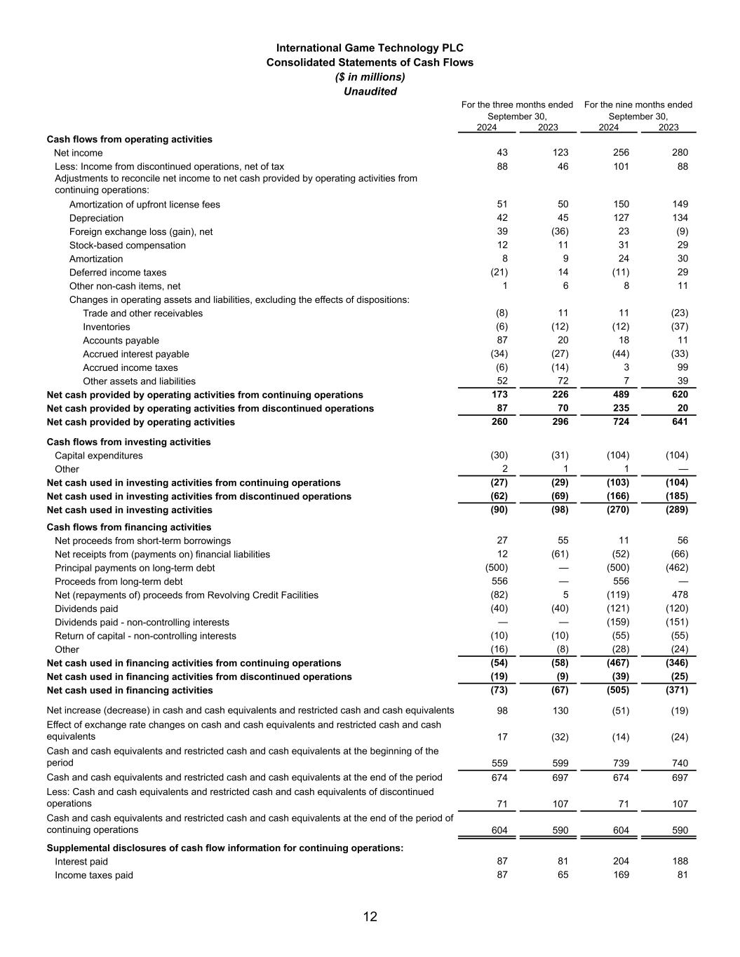 International Game Technology PLC Consolidated Statements of Cash Flows ($ in millions) Unaudited For the three months ended For the nine months ended September 30, September 30, 2024 2023 2024 2023 Cash flows from operating activities Net income 43 123 256 280 Less: Income from discontinued operations, net of tax 88 46 101 88 Adjustments to reconcile net income to net cash provided by operating activities from continuing operations: Amortization of upfront license fees 51 50 150 149 Depreciation 42 45 127 134 Foreign exchange loss (gain), net 39 (36) 23 (9) Stock-based compensation 12 11 31 29 Amortization 8 9 24 30 Deferred income taxes (21) 14 (11) 29 Other non-cash items, net 1 6 8 11 Changes in operating assets and liabilities, excluding the effects of dispositions: Trade and other receivables (8) 11 11 (23) Inventories (6) (12) (12) (37) Accounts payable 87 20 18 11 Accrued interest payable (34) (27) (44) (33) Accrued income taxes (6) (14) 3 99 Other assets and liabilities 52 72 7 39 Net cash provided by operating activities from continuing operations 173 226 489 620 Net cash provided by operating activities from discontinued operations 87 70 235 20 Net cash provided by operating activities 260 296 724 641 Cash flows from investing activities Capital expenditures (30) (31) (104) (104) Other 2 1 1 — Net cash used in investing activities from continuing operations (27) (29) (103) (104) Net cash used in investing activities from discontinued operations (62) (69) (166) (185) Net cash used in investing activities (90) (98) (270) (289) Cash flows from financing activities Net proceeds from short-term borrowings 27 55 11 56 Net receipts from (payments on) financial liabilities 12 (61) (52) (66) Principal payments on long-term debt (500) — (500) (462) Proceeds from long-term debt 556 — 556 — Net (repayments of) proceeds from Revolving Credit Facilities (82) 5 (119) 478 Dividends paid (40) (40) (121) (120) Dividends paid - non-controlling interests — — (159) (151) Return of capital - non-controlling interests (10) (10) (55) (55) Other (16) (8) (28) (24) Net cash used in financing activities from continuing operations (54) (58) (467) (346) Net cash used in financing activities from discontinued operations (19) (9) (39) (25) Net cash used in financing activities (73) (67) (505) (371) Net increase (decrease) in cash and cash equivalents and restricted cash and cash equivalents 98 130 (51) (19) Effect of exchange rate changes on cash and cash equivalents and restricted cash and cash equivalents 17 (32) (14) (24) Cash and cash equivalents and restricted cash and cash equivalents at the beginning of the period 559 599 739 740 Cash and cash equivalents and restricted cash and cash equivalents at the end of the period 674 697 674 697 Less: Cash and cash equivalents and restricted cash and cash equivalents of discontinued operations 71 107 71 107 Cash and cash equivalents and restricted cash and cash equivalents at the end of the period of continuing operations 604 590 604 590 Supplemental disclosures of cash flow information for continuing operations: Interest paid 87 81 204 188 Income taxes paid 87 65 169 81 12