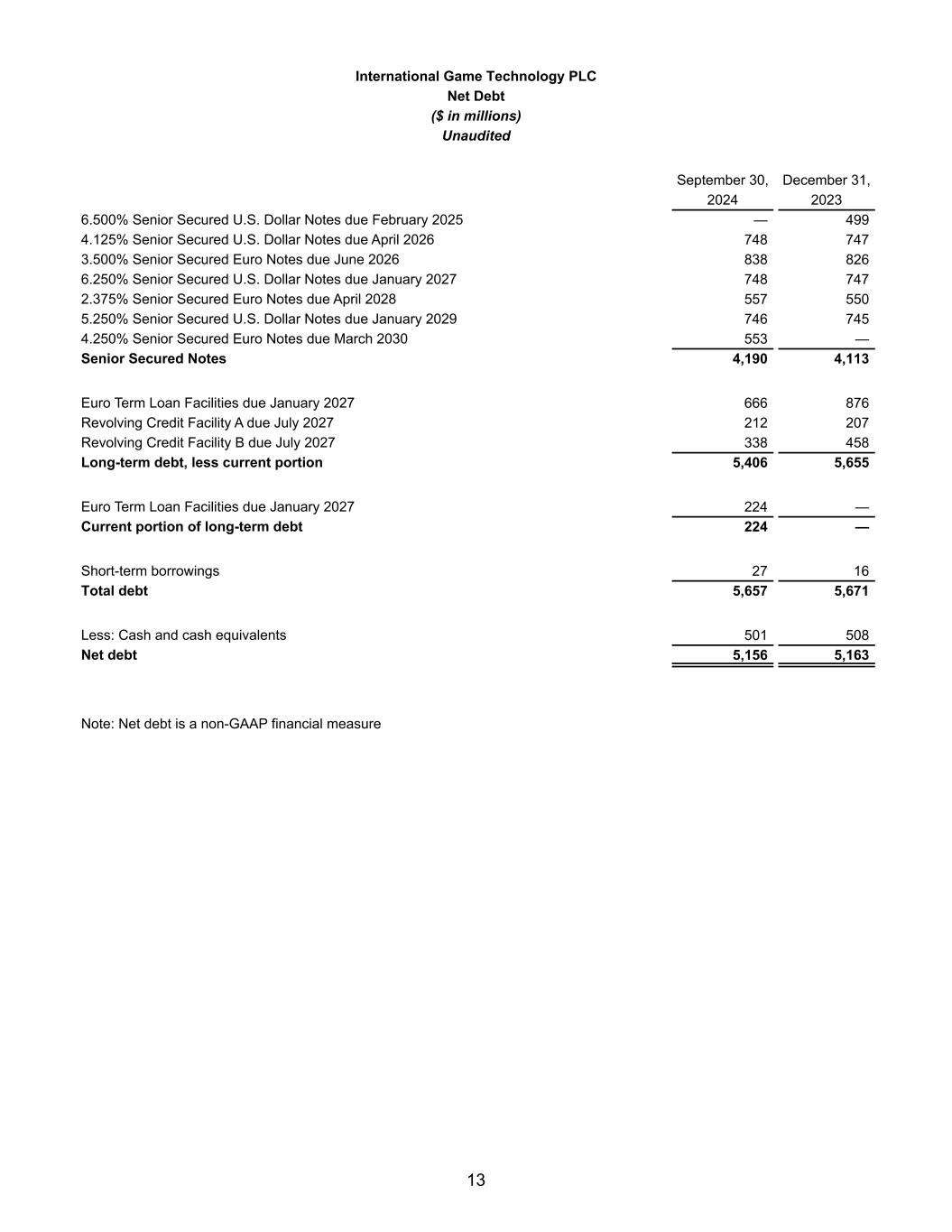 International Game Technology PLC Net Debt ($ in millions) Unaudited September 30, December 31, 2024 2023 6.500% Senior Secured U.S. Dollar Notes due February 2025 — 499 4.125% Senior Secured U.S. Dollar Notes due April 2026 748 747 3.500% Senior Secured Euro Notes due June 2026 838 826 6.250% Senior Secured U.S. Dollar Notes due January 2027 748 747 2.375% Senior Secured Euro Notes due April 2028 557 550 5.250% Senior Secured U.S. Dollar Notes due January 2029 746 745 4.250% Senior Secured Euro Notes due March 2030 553 — Senior Secured Notes 4,190 4,113 Euro Term Loan Facilities due January 2027 666 876 Revolving Credit Facility A due July 2027 212 207 Revolving Credit Facility B due July 2027 338 458 Long-term debt, less current portion 5,406 5,655 Euro Term Loan Facilities due January 2027 224 — Current portion of long-term debt 224 — Short-term borrowings 27 16 Total debt 5,657 5,671 Less: Cash and cash equivalents 501 508 Net debt 5,156 5,163 Note: Net debt is a non-GAAP financial measure 13
