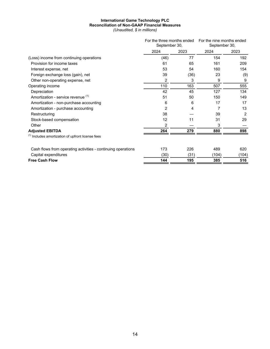 International Game Technology PLC Reconciliation of Non-GAAP Financial Measures (Unaudited, $ in millions) For the three months ended September 30, For the nine months ended September 30, 2024 2023 2024 2023 (Loss) income from continuing operations (46) 77 154 192 Provision for income taxes 61 65 161 209 Interest expense, net 53 54 160 154 Foreign exchange loss (gain), net 39 (36) 23 (9) Other non-operating expense, net 2 3 9 9 Operating income 110 163 507 555 Depreciation 42 45 127 134 Amortization - service revenue (1) 51 50 150 149 Amortization - non-purchase accounting 6 6 17 17 Amortization - purchase accounting 2 4 7 13 Restructuring 38 — 39 2 Stock-based compensation 12 11 31 29 Other 2 — 3 — Adjusted EBITDA 264 279 880 898 (1) Includes amortization of upfront license fees Cash flows from operating activities - continuing operations 173 226 489 620 Capital expenditures (30) (31) (104) (104) Free Cash Flow 144 195 385 516 14