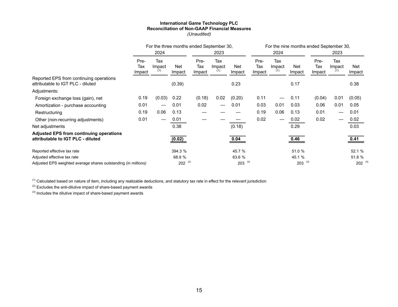 International Game Technology PLC Reconciliation of Non-GAAP Financial Measures (Unaudited) For the three months ended September 30, For the nine months ended September 30, 2024 2023 2024 2023 Pre- Tax Impact Tax Impact (1) Net Impact Pre- Tax Impact Tax Impact (1) Net Impact Pre- Tax Impact Tax Impact (1) Net Impact Pre- Tax Impact Tax Impact (1) Net Impact Reported EPS from continuing operations attributable to IGT PLC - diluted (0.39) 0.23 0.17 0.38 Adjustments: Foreign exchange loss (gain), net 0.19 (0.03) 0.22 (0.18) 0.02 (0.20) 0.11 — 0.11 (0.04) 0.01 (0.05) Amortization - purchase accounting 0.01 — 0.01 0.02 — 0.01 0.03 0.01 0.03 0.06 0.01 0.05 Restructuring 0.19 0.06 0.13 — — — 0.19 0.06 0.13 0.01 — 0.01 Other (non-recurring adjustments) 0.01 — 0.01 — — — 0.02 — 0.02 0.02 — 0.02 Net adjustments 0.38 (0.18) 0.29 0.03 Adjusted EPS from continuing operations attributable to IGT PLC - diluted (0.02) 0.04 0.46 0.41 Reported effective tax rate 394.3 % 45.7 % 51.0 % 52.1 % Adjusted effective tax rate 68.9 % 63.6 % 45.1 % 51.8 % Adjusted EPS weighted average shares outstanding (in millions) 202 (2) 203 (3) 203 (3) 202 (3) (1) Calculated based on nature of item, including any realizable deductions, and statutory tax rate in effect for the relevant jurisdiction (2) Excludes the anti-dilutive impact of share-based payment awards (3) Includes the dilutive impact of share-based payment awards 15