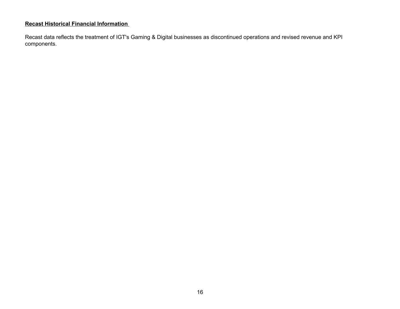 Recast Historical Financial Information Recast data reflects the treatment of IGT's Gaming & Digital businesses as discontinued operations and revised revenue and KPI components. 16