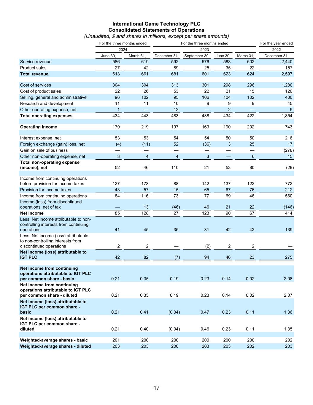 International Game Technology PLC Consolidated Statements of Operations (Unaudited, $ and shares in millions, except per share amounts) For the three months ended For the three months ended For the year ended 2024 2023 2022 June 30, March 31, December 31, September 30, June 30, March 31, December 31, Service revenue 586 619 592 576 588 602 2,440 Product sales 27 42 89 25 35 22 157 Total revenue 613 661 681 601 623 624 2,597 Cost of services 304 304 313 301 298 296 1,280 Cost of product sales 22 26 53 22 21 15 120 Selling, general and administrative 96 102 95 106 104 102 400 Research and development 11 11 10 9 9 9 45 Other operating expense, net 1 — 12 — 2 — 9 Total operating expenses 434 443 483 438 434 422 1,854 Operating income 179 219 197 163 190 202 743 Interest expense, net 53 53 54 54 50 50 216 Foreign exchange (gain) loss, net (4) (11) 52 (36) 3 25 17 Gain on sale of business — — — — — — (278) Other non-operating expense, net 3 4 4 3 — 6 15 Total non-operating expense (income), net 52 46 110 21 53 80 (29) Income from continuing operations before provision for income taxes 127 173 88 142 137 122 772 Provision for income taxes 43 57 15 65 67 76 212 Income from continuing operations 84 116 73 77 69 46 560 Income (loss) from discontinued operations, net of tax — 13 (46) 46 21 22 (146) Net income 85 128 27 123 90 67 414 Less: Net income attributable to non- controlling interests from continuing operations 41 45 35 31 42 42 139 Less: Net income (loss) attributable to non-controlling interests from discontinued operations 2 2 — (2) 2 2 — Net income (loss) attributable to IGT PLC 42 82 (7) 94 46 23 275 Net income from continuing operations attributable to IGT PLC per common share - basic 0.21 0.35 0.19 0.23 0.14 0.02 2.08 Net income from continuing operations attributable to IGT PLC per common share - diluted 0.21 0.35 0.19 0.23 0.14 0.02 2.07 Net income (loss) attributable to IGT PLC per common share - basic 0.21 0.41 (0.04) 0.47 0.23 0.11 1.36 Net income (loss) attributable to IGT PLC per common share - diluted 0.21 0.40 (0.04) 0.46 0.23 0.11 1.35 Weighted-average shares - basic 201 200 200 200 200 200 202 Weighted-average shares - diluted 203 203 200 203 203 202 203 17