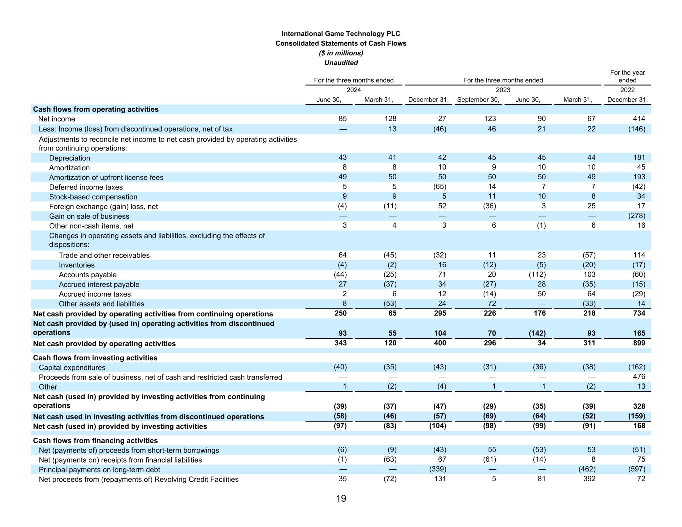 Cash flows from operating activities Net income 85 128 27 123 90 67 414 Less: Income (loss) from discontinued operations, net of tax — 13 (46) 46 21 22 (146) Adjustments to reconcile net income to net cash provided by operating activities from continuing operations: Depreciation 43 41 42 45 45 44 181 Amortization 8 8 10 9 10 10 45 Amortization of upfront license fees 49 50 50 50 50 49 193 Deferred income taxes 5 5 (65) 14 7 7 (42) Stock-based compensation 9 9 5 11 10 8 34 Foreign exchange (gain) loss, net (4) (11) 52 (36) 3 25 17 Gain on sale of business — — — — — — (278) Other non-cash items, net 3 4 3 6 (1) 6 16 Changes in operating assets and liabilities, excluding the effects of dispositions: Trade and other receivables 64 (45) (32) 11 23 (57) 114 Inventories (4) (2) 16 (12) (5) (20) (17) Accounts payable (44) (25) 71 20 (112) 103 (60) Accrued interest payable 27 (37) 34 (27) 28 (35) (15) Accrued income taxes 2 6 12 (14) 50 64 (29) Other assets and liabilities 8 (53) 24 72 — (33) 14 Net cash provided by operating activities from continuing operations 250 65 295 226 176 218 734 Net cash provided by (used in) operating activities from discontinued operations 93 55 104 70 (142) 93 165 Net cash provided by operating activities 343 120 400 296 34 311 899 Cash flows from investing activities Capital expenditures (40) (35) (43) (31) (36) (38) (162) Proceeds from sale of business, net of cash and restricted cash transferred — — — — — — 476 Other 1 (2) (4) 1 1 (2) 13 Net cash (used in) provided by investing activities from continuing operations (39) (37) (47) (29) (35) (39) 328 Net cash used in investing activities from discontinued operations (58) (46) (57) (69) (64) (52) (159) Net cash (used in) provided by investing activities (97) (83) (104) (98) (99) (91) 168 Cash flows from financing activities Net (payments of) proceeds from short-term borrowings (6) (9) (43) 55 (53) 53 (51) Net (payments on) receipts from financial liabilities (1) (63) 67 (61) (14) 8 75 Principal payments on long-term debt — — (339) — — (462) (597) Net proceeds from (repayments of) Revolving Credit Facilities 35 (72) 131 5 81 392 72 International Game Technology PLC Consolidated Statements of Cash Flows ($ in millions) Unaudited For the three months ended For the three months ended For the year ended 2024 2023 2022 June 30, March 31, December 31, September 30, June 30, March 31, December 31, 19
