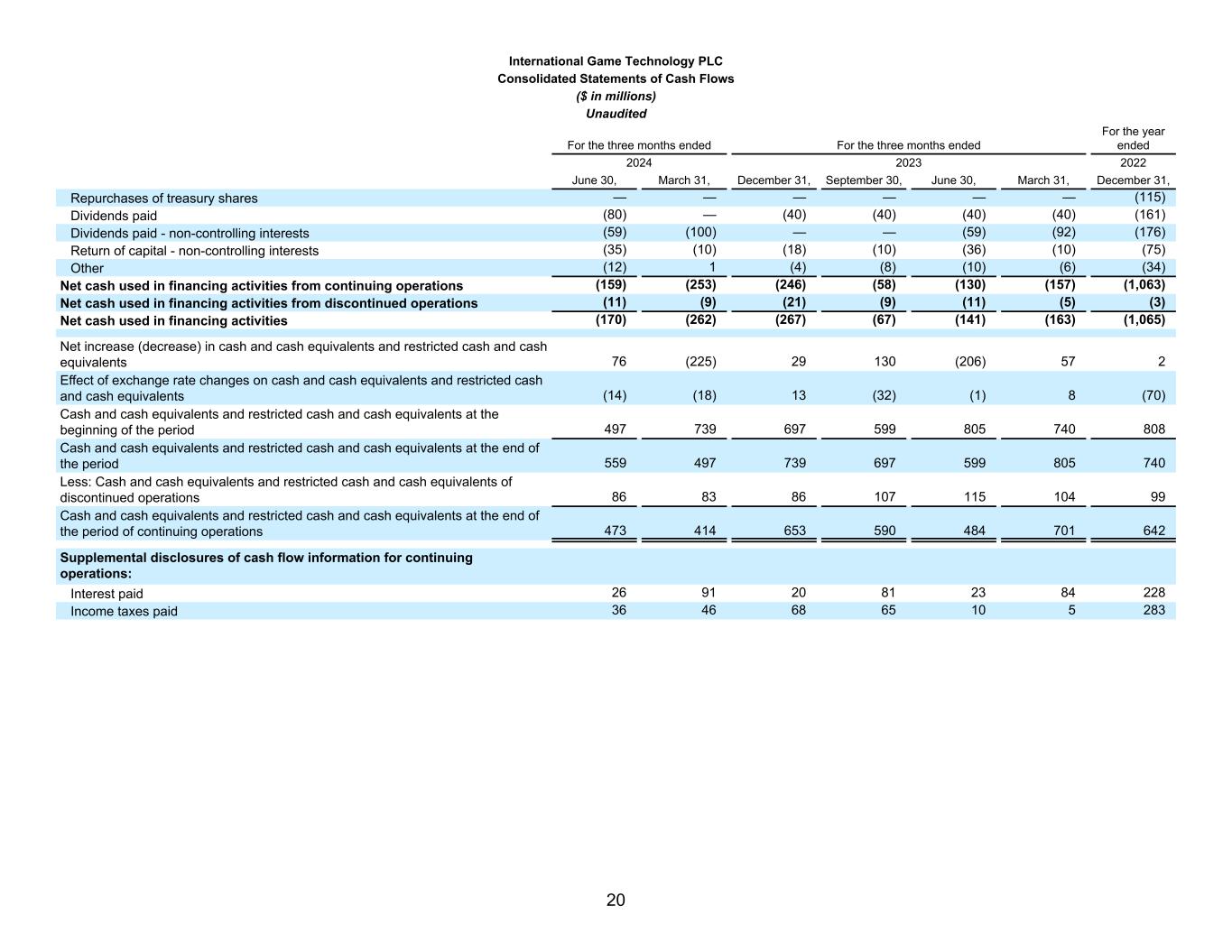 Repurchases of treasury shares — — — — — — (115) Dividends paid (80) — (40) (40) (40) (40) (161) Dividends paid - non-controlling interests (59) (100) — — (59) (92) (176) Return of capital - non-controlling interests (35) (10) (18) (10) (36) (10) (75) Other (12) 1 (4) (8) (10) (6) (34) Net cash used in financing activities from continuing operations (159) (253) (246) (58) (130) (157) (1,063) Net cash used in financing activities from discontinued operations (11) (9) (21) (9) (11) (5) (3) Net cash used in financing activities (170) (262) (267) (67) (141) (163) (1,065) Net increase (decrease) in cash and cash equivalents and restricted cash and cash equivalents 76 (225) 29 130 (206) 57 2 Effect of exchange rate changes on cash and cash equivalents and restricted cash and cash equivalents (14) (18) 13 (32) (1) 8 (70) Cash and cash equivalents and restricted cash and cash equivalents at the beginning of the period 497 739 697 599 805 740 808 Cash and cash equivalents and restricted cash and cash equivalents at the end of the period 559 497 739 697 599 805 740 Less: Cash and cash equivalents and restricted cash and cash equivalents of discontinued operations 86 83 86 107 115 104 99 Cash and cash equivalents and restricted cash and cash equivalents at the end of the period of continuing operations 473 414 653 590 484 701 642 Supplemental disclosures of cash flow information for continuing operations: Interest paid 26 91 20 81 23 84 228 Income taxes paid 36 46 68 65 10 5 283 International Game Technology PLC Consolidated Statements of Cash Flows ($ in millions) Unaudited For the three months ended For the three months ended For the year ended 2024 2023 2022 June 30, March 31, December 31, September 30, June 30, March 31, December 31, 20