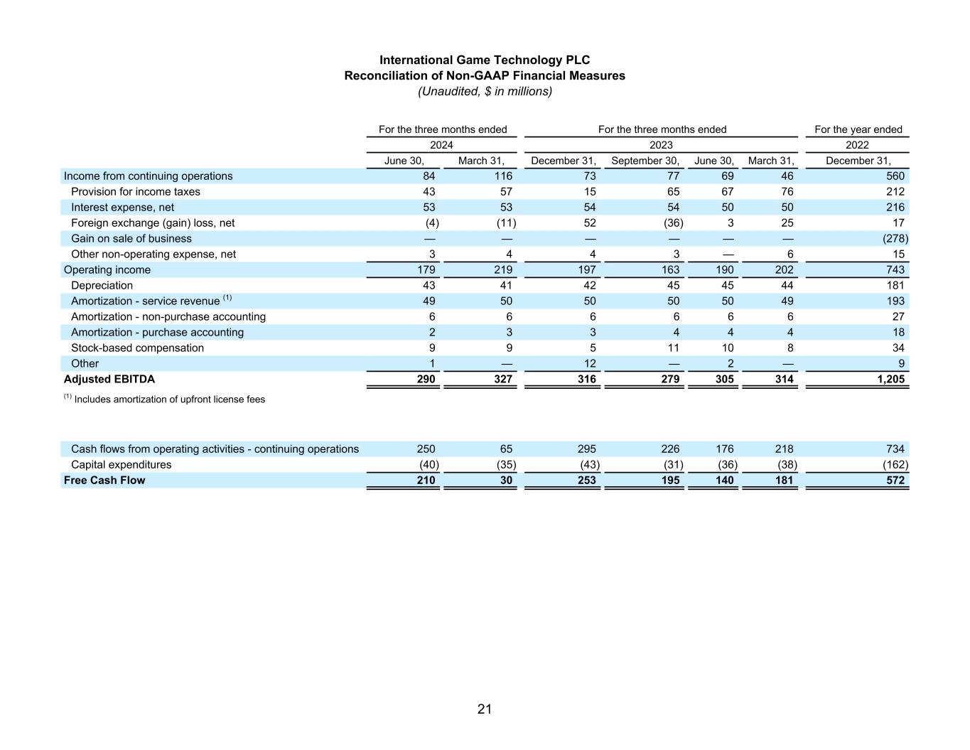 International Game Technology PLC Reconciliation of Non-GAAP Financial Measures (Unaudited, $ in millions) For the three months ended For the three months ended For the year ended 2024 2023 2022 June 30, March 31, December 31, September 30, June 30, March 31, December 31, Income from continuing operations 84 116 73 77 69 46 560 Provision for income taxes 43 57 15 65 67 76 212 Interest expense, net 53 53 54 54 50 50 216 Foreign exchange (gain) loss, net (4) (11) 52 (36) 3 25 17 Gain on sale of business — — — — — — (278) Other non-operating expense, net 3 4 4 3 — 6 15 Operating income 179 219 197 163 190 202 743 Depreciation 43 41 42 45 45 44 181 Amortization - service revenue (1) 49 50 50 50 50 49 193 Amortization - non-purchase accounting 6 6 6 6 6 6 27 Amortization - purchase accounting 2 3 3 4 4 4 18 Stock-based compensation 9 9 5 11 10 8 34 Other 1 — 12 — 2 — 9 Adjusted EBITDA 290 327 316 279 305 314 1,205 (1) Includes amortization of upfront license fees Cash flows from operating activities - continuing operations 250 65 295 226 176 218 734 Capital expenditures (40) (35) (43) (31) (36) (38) (162) Free Cash Flow 210 30 253 195 140 181 572 21
