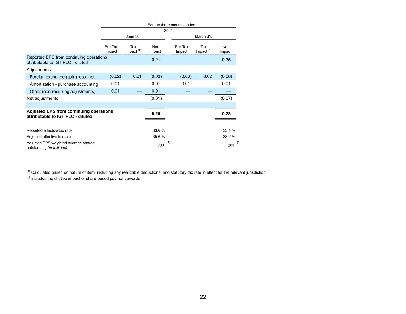For the three months ended 2024 June 30, March 31, Pre-Tax Impact Tax Impact (1) Net Impact Pre-Tax Impact Tax Impact (1) Net Impact Reported EPS from continuing operations attributable to IGT PLC - diluted 0.21 0.35 Adjustments: Foreign exchange (gain) loss, net (0.02) 0.01 (0.03) (0.06) 0.02 (0.08) Amortization - purchase accounting 0.01 — 0.01 0.01 — 0.01 Other (non-recurring adjustments) 0.01 — 0.01 — — — Net adjustments (0.01) (0.07) Adjusted EPS from continuing operations attributable to IGT PLC - diluted 0.20 0.28 Reported effective tax rate 33.6 % 33.1 % Adjusted effective tax rate 35.6 % 38.2 % Adjusted EPS weighted average shares outstanding (in millions) 203 (2) 203 (2) (1) Calculated based on nature of item, including any realizable deductions, and statutory tax rate in effect for the relevant jurisdiction (2) Includes the dilutive impact of share-based payment awards 22