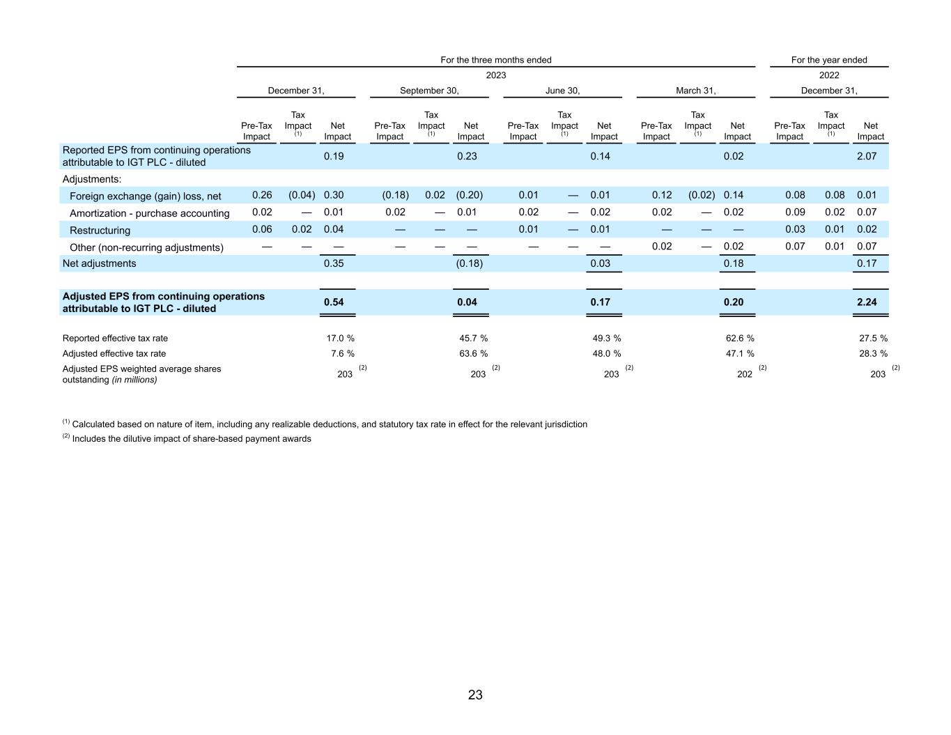 For the three months ended For the year ended 2023 2022 December 31, September 30, June 30, March 31, December 31, Pre-Tax Impact Tax Impact (1) Net Impact Pre-Tax Impact Tax Impact (1) Net Impact Pre-Tax Impact Tax Impact (1) Net Impact Pre-Tax Impact Tax Impact (1) Net Impact Pre-Tax Impact Tax Impact (1) Net Impact Reported EPS from continuing operations attributable to IGT PLC - diluted 0.19 0.23 0.14 0.02 2.07 Adjustments: Foreign exchange (gain) loss, net 0.26 (0.04) 0.30 (0.18) 0.02 (0.20) 0.01 — 0.01 0.12 (0.02) 0.14 0.08 0.08 0.01 Amortization - purchase accounting 0.02 — 0.01 0.02 — 0.01 0.02 — 0.02 0.02 — 0.02 0.09 0.02 0.07 Restructuring 0.06 0.02 0.04 — — — 0.01 — 0.01 — — — 0.03 0.01 0.02 Other (non-recurring adjustments) — — — — — — — — — 0.02 — 0.02 0.07 0.01 0.07 Net adjustments 0.35 (0.18) 0.03 0.18 0.17 Adjusted EPS from continuing operations attributable to IGT PLC - diluted 0.54 0.04 0.17 0.20 2.24 Reported effective tax rate 17.0 % 45.7 % 49.3 % 62.6 % 27.5 % Adjusted effective tax rate 7.6 % 63.6 % 48.0 % 47.1 % 28.3 % Adjusted EPS weighted average shares outstanding (in millions) 203 (2) 203 (2) 203 (2) 202 (2) 203 (2) (1) Calculated based on nature of item, including any realizable deductions, and statutory tax rate in effect for the relevant jurisdiction (2) Includes the dilutive impact of share-based payment awards 23