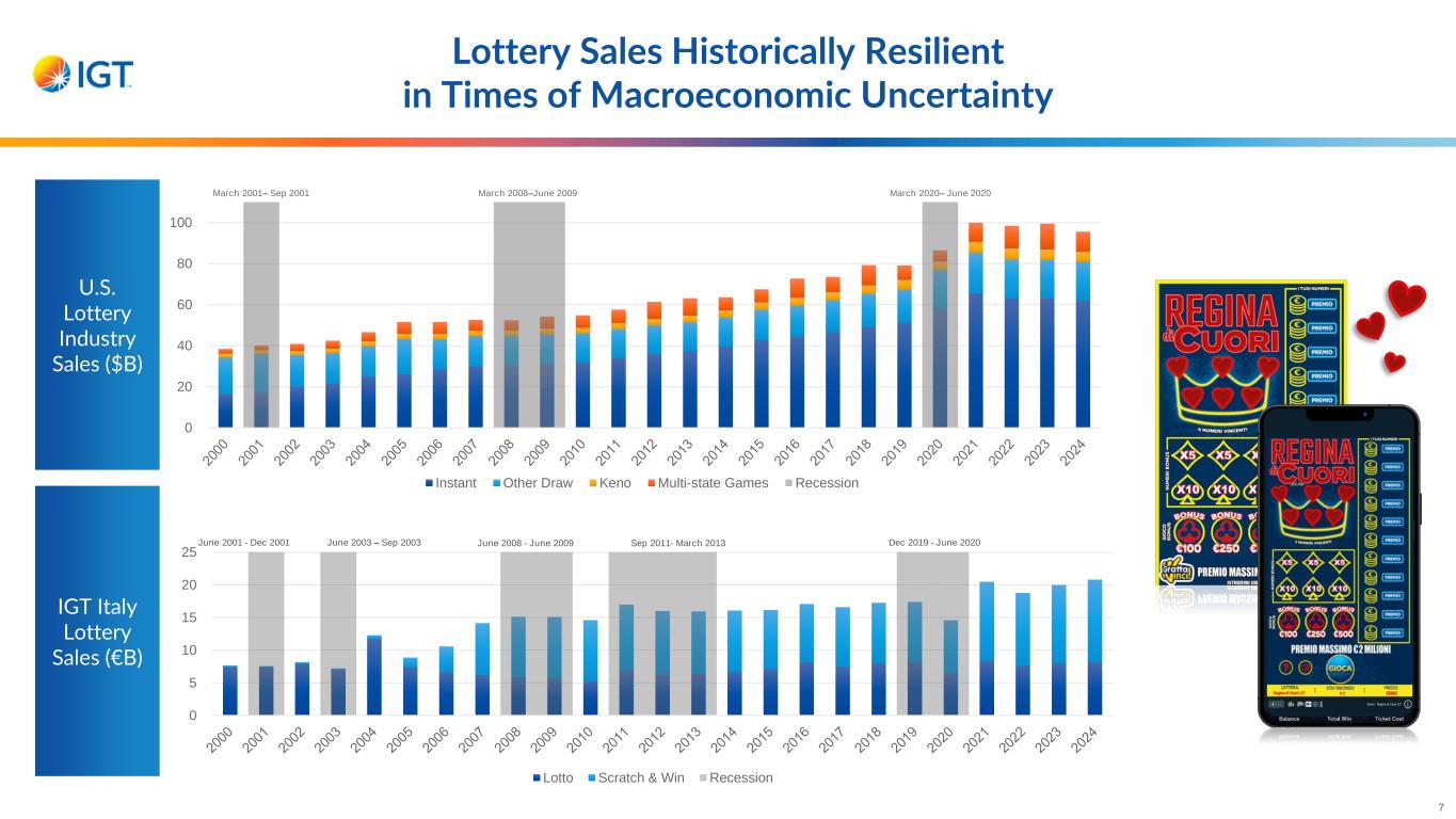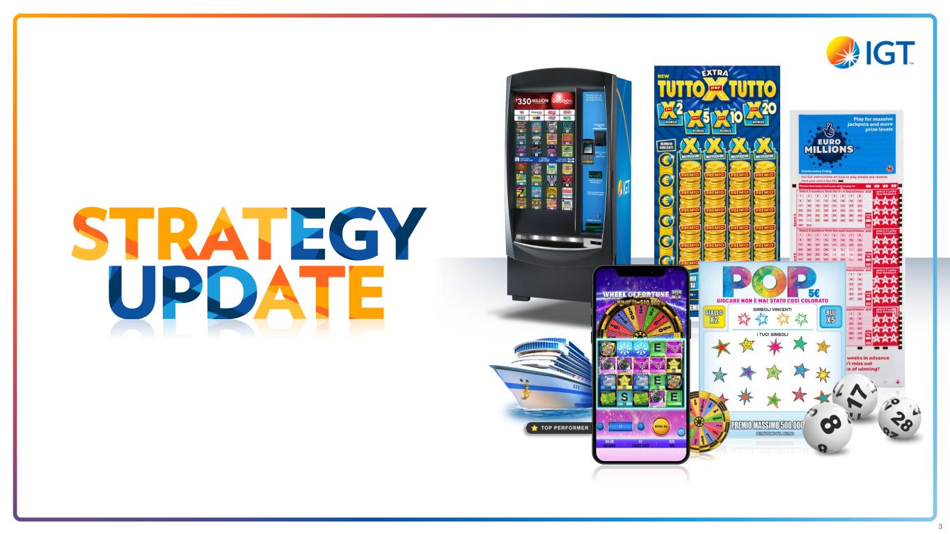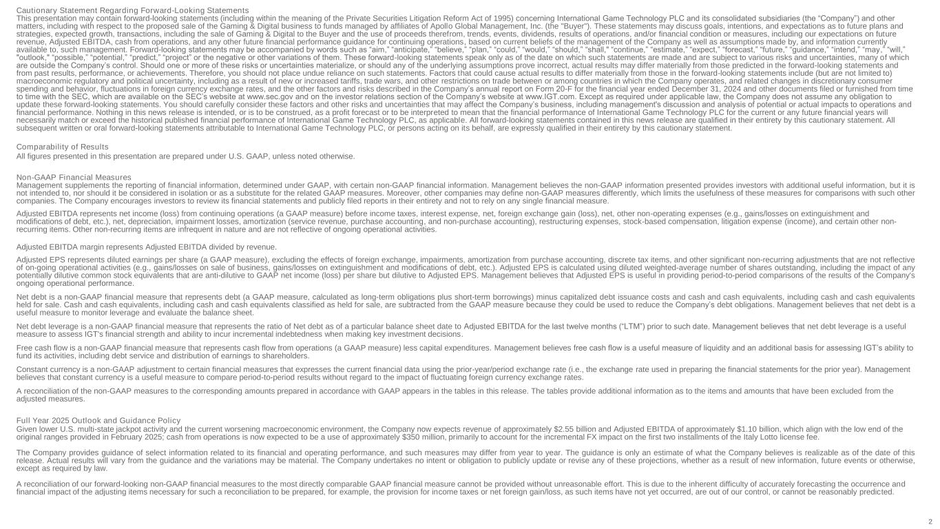 2 Cautionary Statement Regarding Forward-Looking Statements This presentation may contain forward-looking statements (including within the meaning of the Private Securities Litigation Reform Act of 1995) concerning International Game Technology PLC and its consolidated subsidiaries (the “Company”) and other matters, including with respect to the proposed sale of the Gaming & Digital business to funds managed by affiliates of Apollo Global Management, Inc. (the "Buyer"). These statements may discuss goals, intentions, and expectations as to future plans and strategies, expected growth, transactions, including the sale of Gaming & Digital to the Buyer and the use of proceeds therefrom, trends, events, dividends, results of operations, and/or financial condition or measures, including our expectations on future revenue, Adjusted EBITDA, cash from operations, and any other future financial performance guidance for continuing operations, based on current beliefs of the management of the Company as well as assumptions made by, and information currently available to, such management. Forward-looking statements may be accompanied by words such as “aim,” “anticipate,” “believe,” “plan,” “could,” “would,” “should,” “shall," “continue,” “estimate,” “expect,” “forecast,” “future,” “guidance,” “intend,” “may,” “will,” "outlook," “possible,” “potential,” “predict,” “project” or the negative or other variations of them. These forward-looking statements speak only as of the date on which such statements are made and are subject to various risks and uncertainties, many of which are outside the Company’s control. Should one or more of these risks or uncertainties materialize, or should any of the underlying assumptions prove incorrect, actual results may differ materially from those predicted in the forward-looking statements and from past results, performance, or achievements. Therefore, you should not place undue reliance on such statements. Factors that could cause actual results to differ materially from those in the forward-looking statements include (but are not limited to) macroeconomic regulatory and political uncertainty, including as a result of new or increased tariffs, trade wars, and other restrictions on trade between or among countries in which the Company operates, and related changes in discretionary consumer spending and behavior, fluctuations in foreign currency exchange rates, and the other factors and risks described in the Company’s annual report on Form 20-F for the financial year ended December 31, 2024 and other documents filed or furnished from time to time with the SEC, which are available on the SEC’s website at www.sec.gov and on the investor relations section of the Company’s website at www.IGT.com. Except as required under applicable law, the Company does not assume any obligation to update these forward-looking statements. You should carefully consider these factors and other risks and uncertainties that may affect the Company’s business, including management's discussion and analysis of potential or actual impacts to operations and financial performance. Nothing in this news release is intended, or is to be construed, as a profit forecast or to be interpreted to mean that the financial performance of International Game Technology PLC for the current or any future financial years will necessarily match or exceed the historical published financial performance of International Game Technology PLC, as applicable. All forward-looking statements contained in this news release are qualified in their entirety by this cautionary statement. All subsequent written or oral forward-looking statements attributable to International Game Technology PLC, or persons acting on its behalf, are expressly qualified in their entirety by this cautionary statement. Comparability of Results All figures presented in this presentation are prepared under U.S. GAAP, unless noted otherwise. Non-GAAP Financial Measures Management supplements the reporting of financial information, determined under GAAP, with certain non-GAAP financial information. Management believes the non-GAAP information presented provides investors with additional useful information, but it is not intended to, nor should it be considered in isolation or as a substitute for the related GAAP measures. Moreover, other companies may define non-GAAP measures differently, which limits the usefulness of these measures for comparisons with such other companies. The Company encourages investors to review its financial statements and publicly filed reports in their entirety and not to rely on any single financial measure. Adjusted EBITDA represents net income (loss) from continuing operations (a GAAP measure) before income taxes, interest expense, net, foreign exchange gain (loss), net, other non-operating expenses (e.g., gains/losses on extinguishment and modifications of debt, etc.), net, depreciation, impairment losses, amortization (service revenue, purchase accounting, and non-purchase accounting), restructuring expenses, stock-based compensation, litigation expense (income), and certain other non- recurring items. Other non-recurring items are infrequent in nature and are not reflective of ongoing operational activities. Adjusted EBITDA margin represents Adjusted EBITDA divided by revenue. Adjusted EPS represents diluted earnings per share (a GAAP measure), excluding the effects of foreign exchange, impairments, amortization from purchase accounting, discrete tax items, and other significant non-recurring adjustments that are not reflective of on-going operational activities (e.g., gains/losses on sale of business, gains/losses on extinguishment and modifications of debt, etc.). Adjusted EPS is calculated using diluted weighted-average number of shares outstanding, including the impact of any potentially dilutive common stock equivalents that