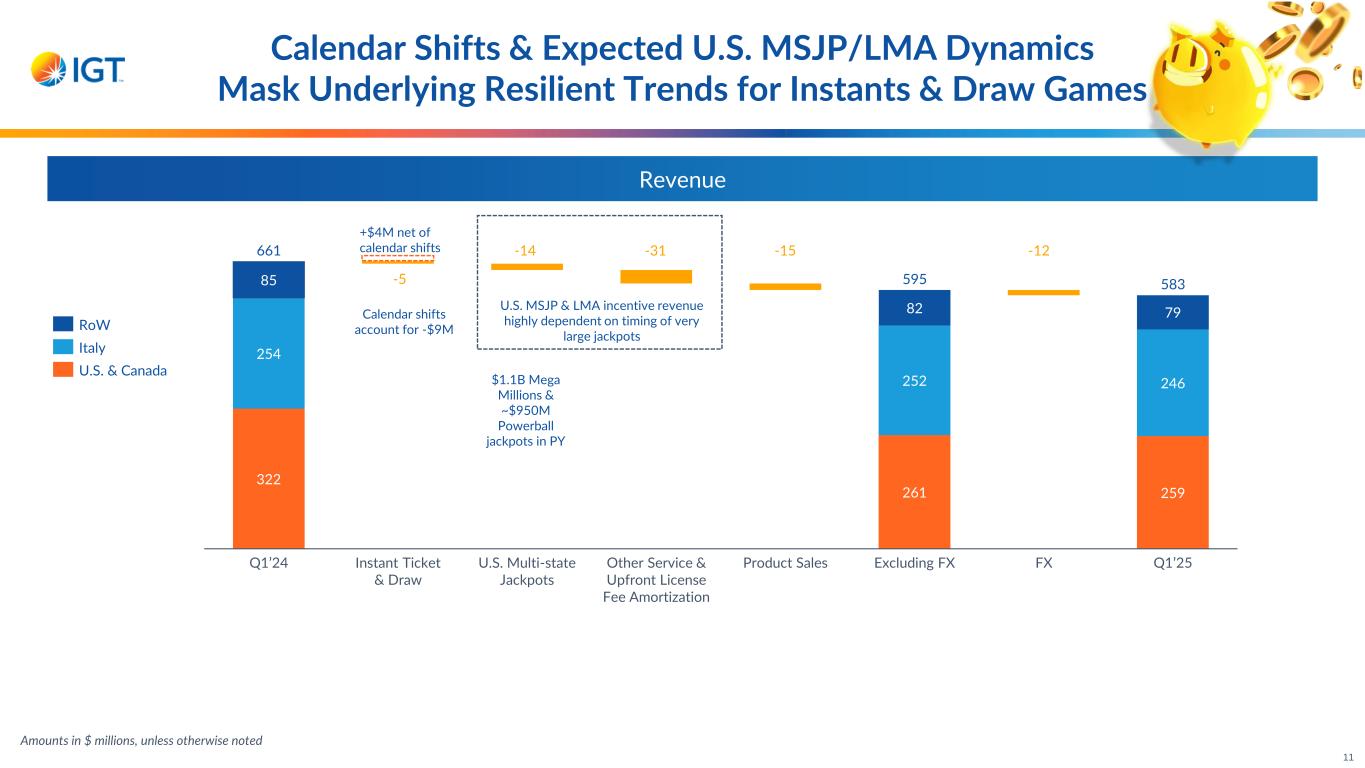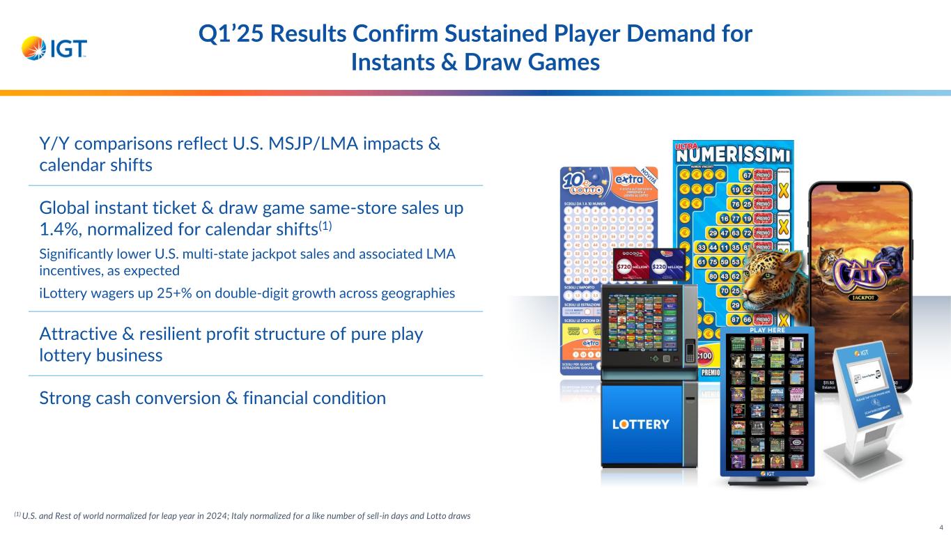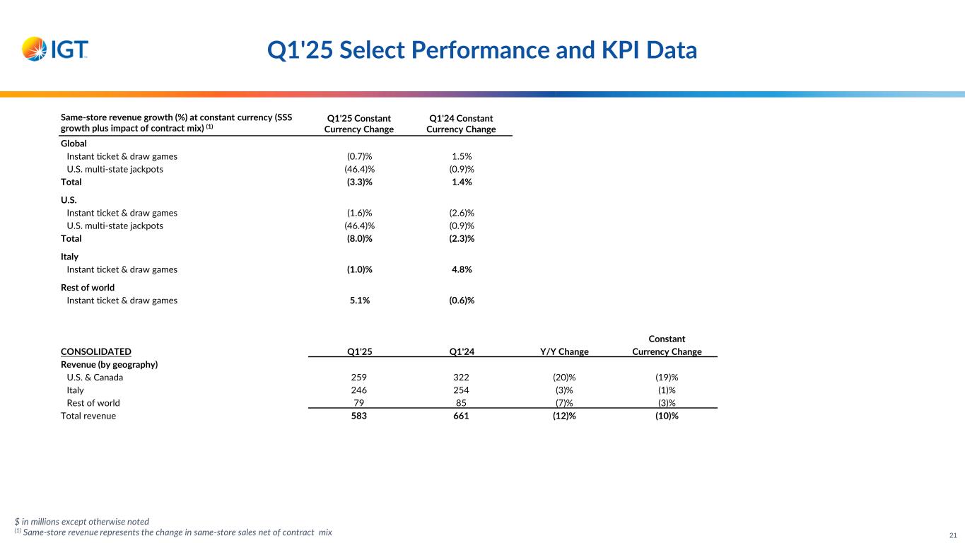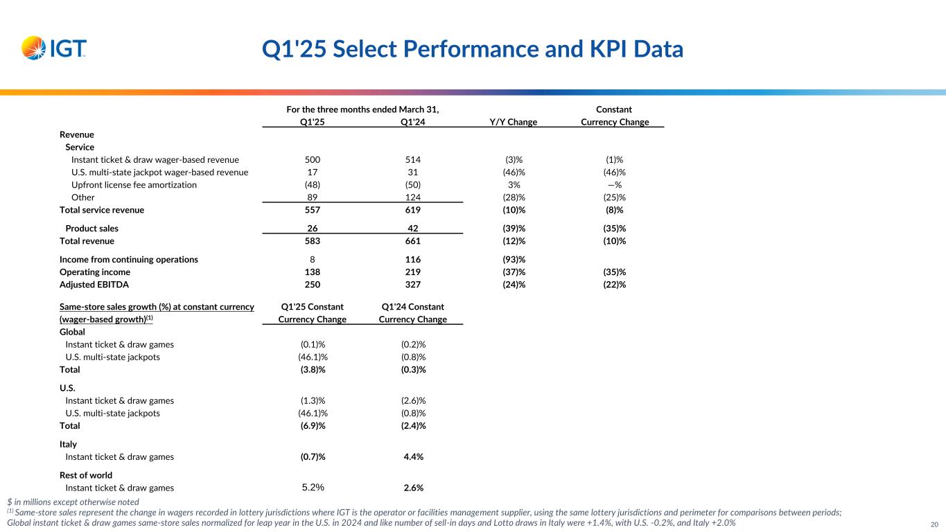 $ in millions except otherwise noted (1) Same-store sales represent the change in wagers recorded in lottery jurisdictions where IGT is the operator or facilities management supplier, using the same lottery jurisdictions and perimeter for comparisons between periods; Global instant ticket & draw games same-store sales normalized for leap year in the U.S. in 2024 and like number of sell-in days and Lotto draws in Italy were +1.4%, with U.S. -0.2%, and Italy +2.0% Q1'25 Select Performance and KPI Data For the three months ended March 31, Constant Q1'25 Q1'24 Y/Y Change Currency Change Revenue Service Instant ticket & draw wager-based revenue 500 514 (3)% (1)% U.S. multi-state jackpot wager-based revenue 17 31 (46)% (46)% Upfront license fee amortization (48) (50) 3% —% Other 89 124 (28)% (25)% Total service revenue 557 619 (10)% (8)% Product sales 26 42 (39)% (35)% Total revenue 583 661 (12)% (10)% Income from continuing operations 8 116 (93)% Operating income 138 219 (37)% (35)% Adjusted EBITDA 250 327 (24)% (22)% Same-store sales growth (%) at constant currency Q1'25 Constant Q1'24 Constant (wager-based growth)(1) Currency Change Currency Change Global Instant ticket & draw games (0.1)% (0.2)% U.S. multi-state jackpots (46.1)% (0.8)% Total (3.8)% (0.3)% U.S. Instant ticket & draw games (1.3)% (2.6)% U.S. multi-state jackpots (46.1)% (0.8)% Total (6.9)% (2.4)% Italy Instant ticket & draw games (0.7)% 4.4% Rest of world Instant ticket & draw games 5.2% 2.6% 20