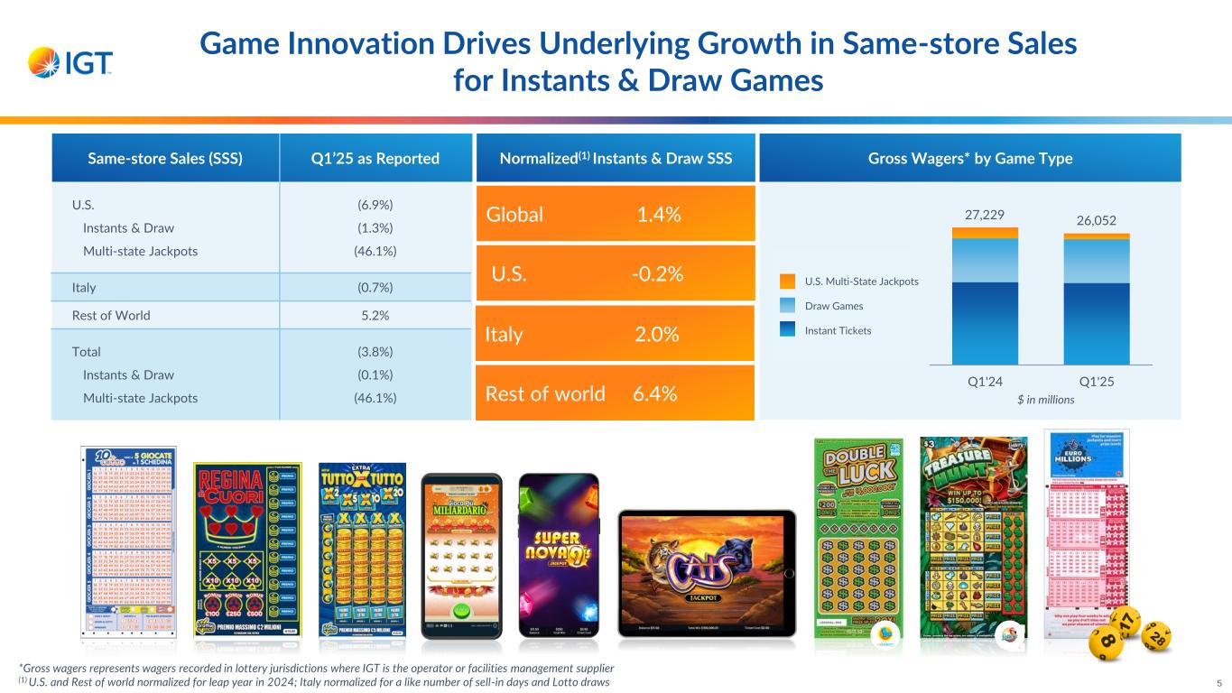 Q1’25 Results Confirm Sustained Player Demand for Instants & Draw Games (1) U.S. and Rest of world normalized for leap year in 2024; Italy normalized for a like number of sell-in days and Lotto draws Y/Y comparisons reflect U.S. MSJP/LMA impacts & calendar shifts Global instant ticket & draw game same-store sales up 1.4%, normalized for calendar shifts(1) Significantly lower U.S. multi-state jackpot sales and associated LMA incentives, as expected iLottery wagers up 25+% on double-digit growth across geographies Attractive & resilient profit structure of pure play lottery business Strong cash conversion & financial condition 4