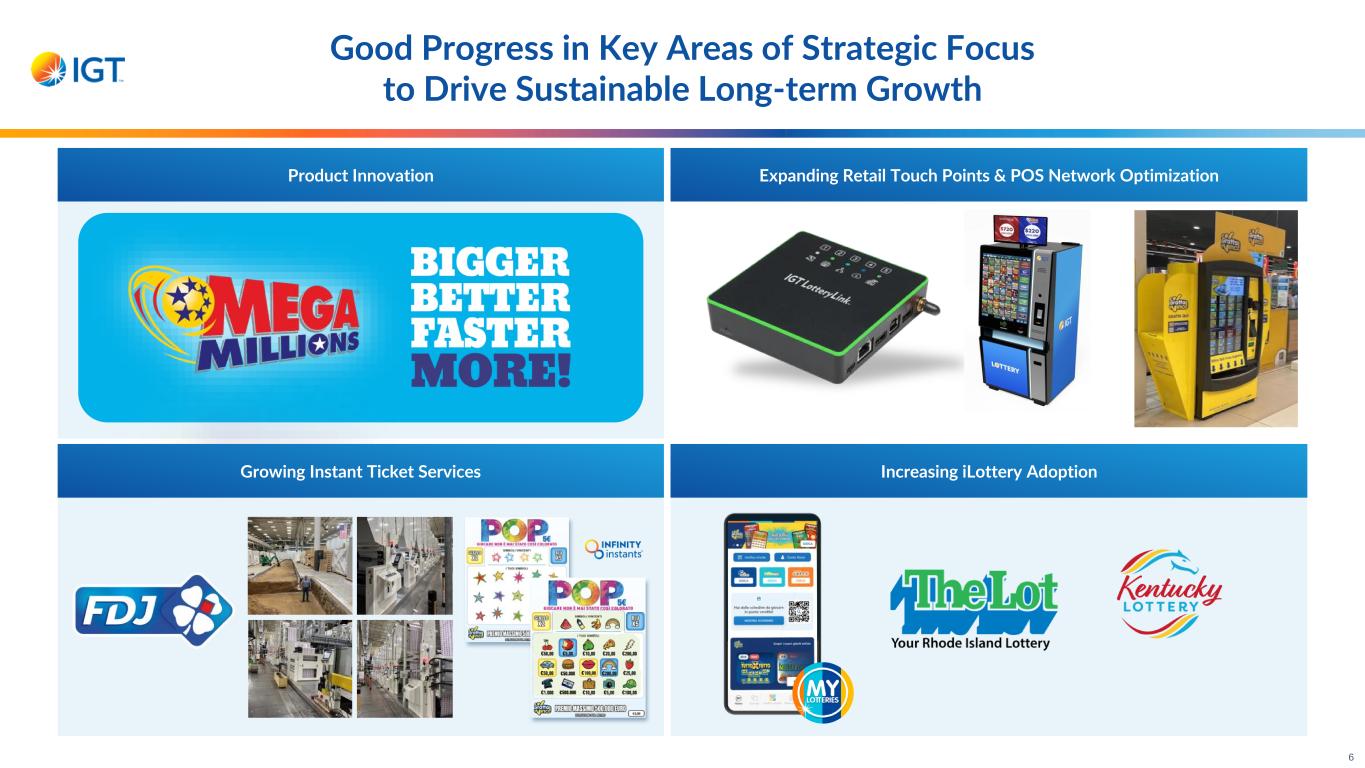 Same-store Sales (SSS) Q1’25 as Reported U.S. Instants & Draw Multi-state Jackpots (6.9%) (1.3%) (46.1%) Italy (0.7%) Rest of World 5.2% Total Instants & Draw Multi-state Jackpots (3.8%) (0.1%) (46.1%) Game Innovation Drives Underlying Growth in Same-store Sales for Instants & Draw Games 5 *Gross wagers represents wagers recorded in lottery jurisdictions where IGT is the operator or facilities management supplier (1) U.S. and Rest of world normalized for leap year in 2024; Italy normalized for a like number of sell-in days and Lotto draws Q1'24 Q1'25 U.S. Multi-state Jackpots Draw Games Instant Tickets 26,052 $ in millions 27,229 U.S. -0.2% Italy 2.0% Normalized(1) Instants & Draw SSS Gross Wagers* by Game Type U.S. Multi-State Jackpots Dra Games Instant Tickets Global 1.4% Rest of world 6.4%