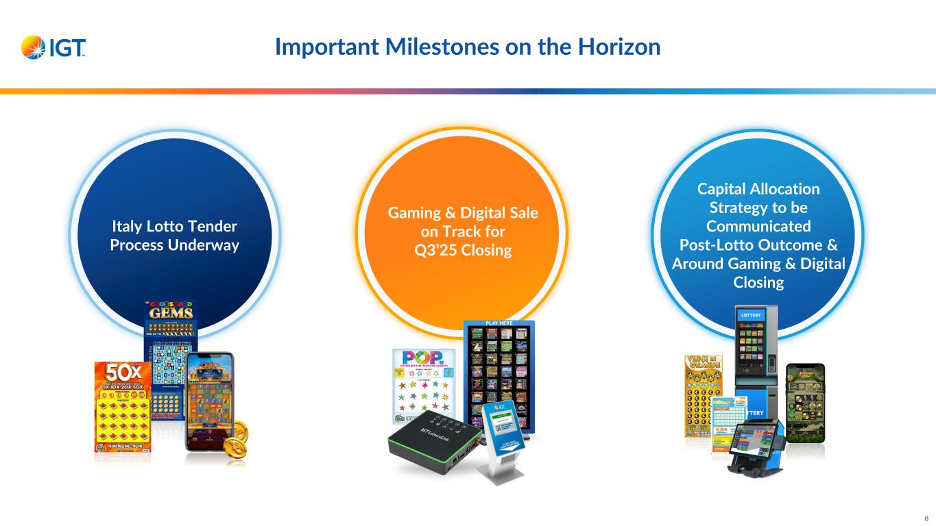 8 Important Milestones on the Horizon Italy Lotto Tender Process Underway Gaming & Digital Sale on Track for Q3’25 Closing Capital Allocation Strategy to be Communicated Post-Lotto Outcome & Around Gaming & Digital Closing
