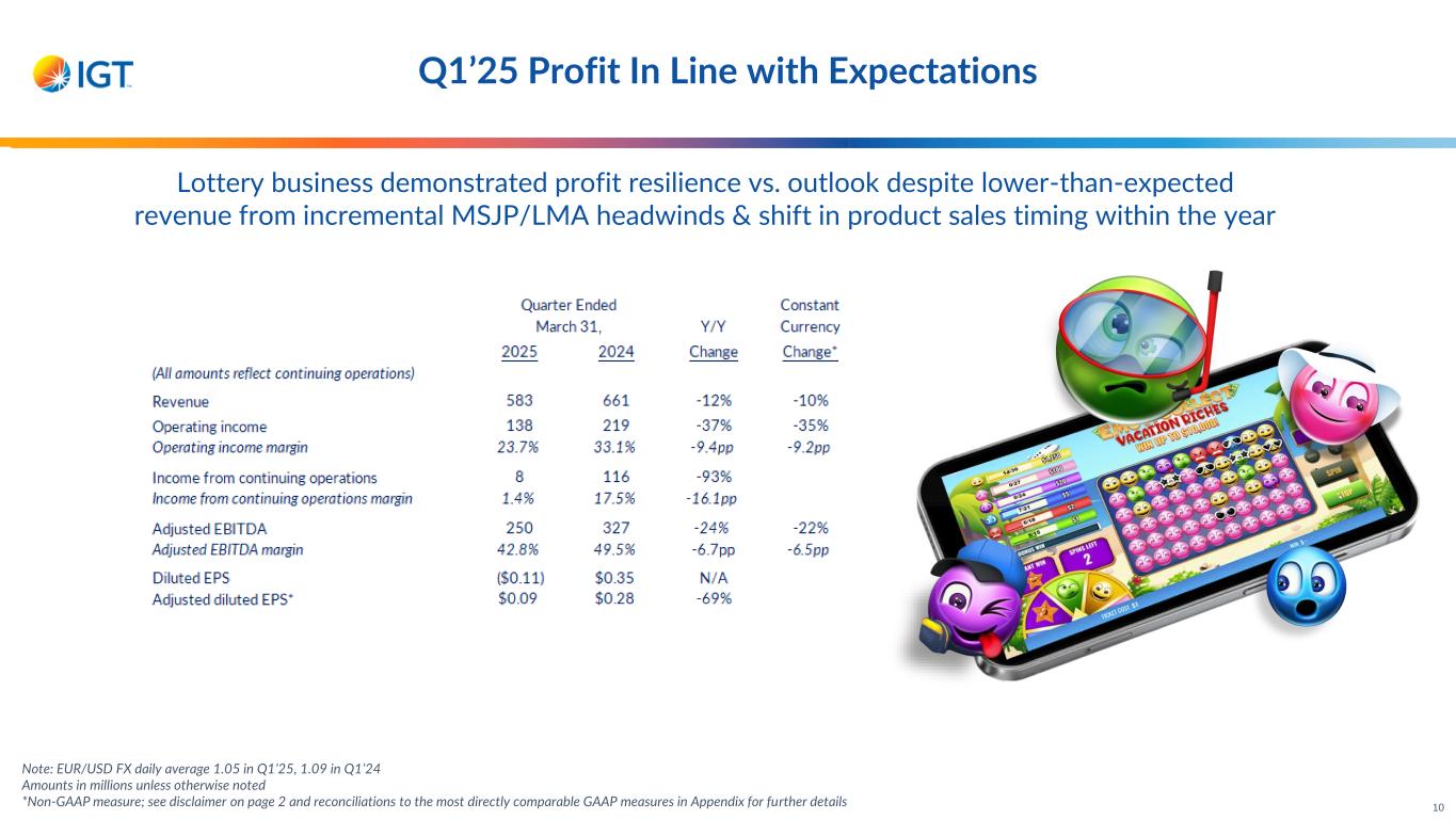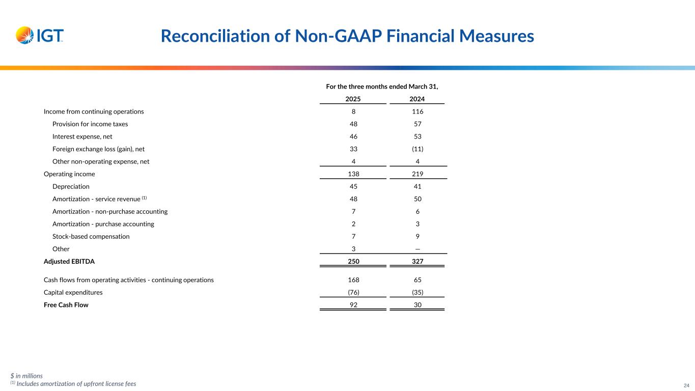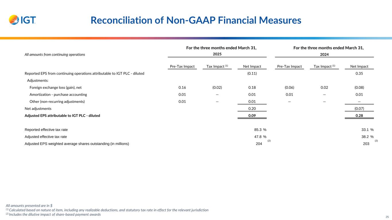 For the three months ended March 31, For the three months ended March 31, All amounts from continuing operations 2025 2024 Pre-Tax Impact Tax Impact (1) Net Impact Pre-Tax Impact Tax Impact (1) Net Impact Reported EPS from continuing operations attributable to IGT PLC - diluted (0.11) 0.35 Adjustments: Foreign exchange loss (gain), net 0.16 (0.02) 0.18 (0.06) 0.02 (0.08) Amortization - purchase accounting 0.01 — 0.01 0.01 — 0.01 Other (non-recurring adjustments) 0.01 — 0.01 — — — Net adjustments 0.20 (0.07) Adjusted EPS attributable to IGT PLC - diluted 0.09 0.28 Reported effective tax rate 85.3 % 33.1 % Adjusted effective tax rate 47.8 % 38.2 % Adjusted EPS weighted average shares outstanding (in millions) 204 (2) 203 (2) Reconciliation of Non-GAAP Financial Measures All amounts presented are in $ (1) Calculated based on nature of item, including any realizable deductions, and statutory tax rate in effect for the relevant jurisdiction (2) Includes the dilutive impact of share-based payment awards 25