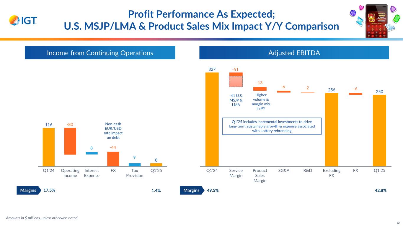 322 261 259 254 252 246 85 82 79Calendar shifts account for -$9M Q1’24 Instant Ticket & Draw U.S. Multi-state Jackpots Other Service & Upfront License Fee Amortization Product Sales Excluding FX FX Q1’25 661 595 583 Calendar Shifts & Expected U.S. MSJP/LMA Dynamics Mask Underlying Resilient Trends for Instants & Draw Games 11 Amounts in $ millions, unless otherwise noted RoW Italy U.S. & Canada Revenue -5 -14 -31 -15 -12 $1.1B Mega Millions & ~$950M Powerball jackpots in PY U.S. MSJP & LMA incentive revenue highly dependent on timing of very large jackpots +$4M net of calendar shifts