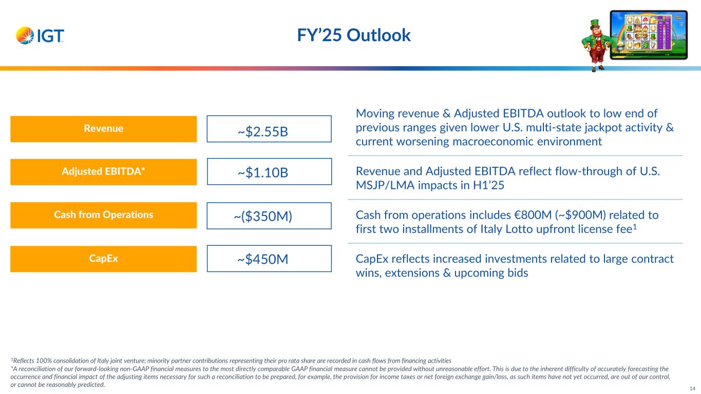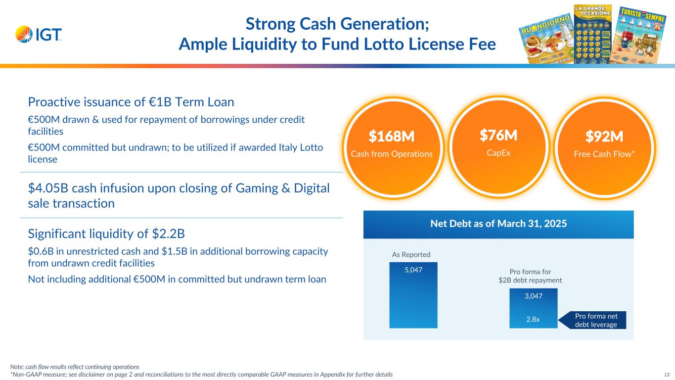 Strong Cash Generation; Ample Liquidity to Fund Lotto License Fee Note: cash flow results reflect continuing operations *Non-GAAP measure; see disclaimer on page 2 and reconciliations to the most directly comparable GAAP measures in Appendix for further details $168M Cash from Operations $92M Free Cash Flow* $76M CapEx Proactive issuance of €1B Term Loan €500M drawn & used for repayment of borrowings under credit facilities €500M committed but undrawn; to be utilized if awarded Italy Lotto license $4.05B cash infusion upon closing of Gaming & Digital sale transaction Significant liquidity of $2.2B $0.6B in unrestricted cash and $1.5B in additional borrowing capacity from undrawn credit facilities Not including additional €500M in committed but undrawn term loan Net Debt as of March 31, 2025 5,047 3,047 Pro forma for $2B debt repayment 2.8x As Reported Pro forma net debt leverage 13