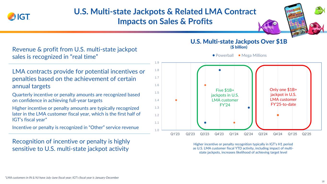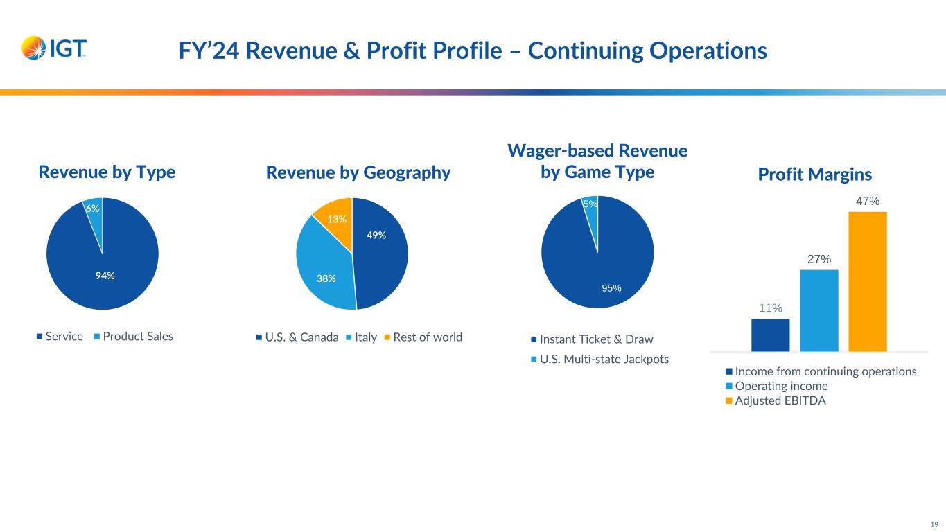 U.S. Multi-state Jackpots & Related LMA Contract Impacts on Sales & Profits 18 Higher incentive or penalty recognition typically in IGT’s H1 period as U.S. LMA customer fiscal YTD activity, including impact of multi- state jackpots, increases likelihood of achieving target level 1.0 1.1 1.2 1.3 1.4 1.5 1.6 1.7 1.8 1.9 U.S. Multi-state Jackpots Over $1B ($ billion) Powerball Mega Millions Q1’23 Q2’23 Q3’23 Q4’23 Q1’24 Q2’24 Q3’24 Q4’24 Q1’25 Q2’25 Only one $1B+ jackpot in U.S. LMA customer FY’25-to-date Five $1B+ jackpots in U.S. LMA customer FY’24 Revenue & profit from U.S. multi-state jackpot sales is recognized in “real time” LMA contracts provide for potential incentives or penalties based on the achievement of certain annual targets Quarterly incentive or penalty amounts are recognized based on confidence in achieving full-year targets Higher incentive or penalty amounts are typically recognized later in the LMA customer fiscal year, which is the first half of IGT’s fiscal year* Incentive or penalty is recognized in “Other” service revenue Recognition of incentive or penalty is highly sensitive to U.S. multi-state jackpot activity *LMA customers in IN & NJ have July-June fiscal year; IGT’s fiscal year is January-December