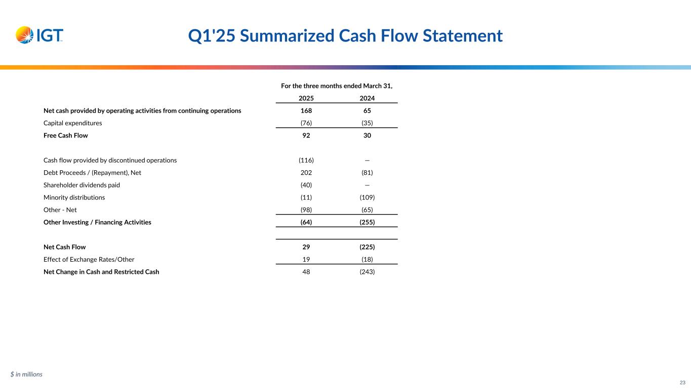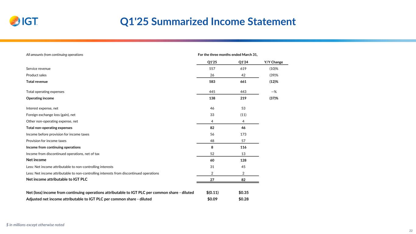 Q1'25 Summarized Income Statement All amounts from continuing operations For the three months ended March 31, Q1'25 Q1'24 Y/Y Change Service revenue 557 619 (10)% Product sales 26 42 (39)% Total revenue 583 661 (12)% Total operating expenses 445 443 —% Operating income 138 219 (37)% Interest expense, net 46 53 Foreign exchange loss (gain), net 33 (11) Other non-operating expense, net 4 4 Total non-operating expenses 82 46 Income before provision for income taxes 56 173 Provision for income taxes 48 57 Income from continuing operations 8 116 Income from discontinued operations, net of tax 52 13 Net income 60 128 Less: Net income attributable to non-controlling interests 31 45 Less: Net income attributable to non-controlling interests from discontinued operations 2 2 Net income attributable to IGT PLC 27 82 Net (loss) income from continuing operations attributable to IGT PLC per common share - diluted $(0.11) $0.35 Adjusted net income attributable to IGT PLC per common share - diluted $0.09 $0.28 $ in millions except otherwise noted 22