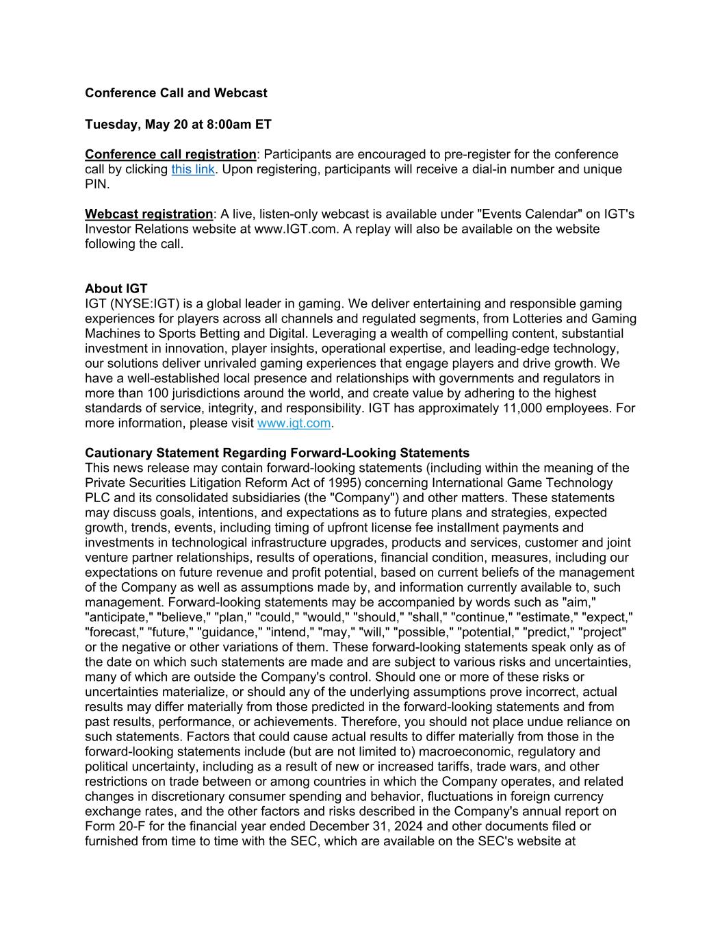 Conference Call and Webcast Tuesday, May 20 at 8:00am ET Conference call registration: Participants are encouraged to pre-register for the conference call by clicking this link. Upon registering, participants will receive a dial-in number and unique PIN. Webcast registration: A live, listen-only webcast is available under "Events Calendar" on IGT's Investor Relations website at www.IGT.com. A replay will also be available on the website following the call. About IGT IGT (NYSE:IGT) is a global leader in gaming. We deliver entertaining and responsible gaming experiences for players across all channels and regulated segments, from Lotteries and Gaming Machines to Sports Betting and Digital. Leveraging a wealth of compelling content, substantial investment in innovation, player insights, operational expertise, and leading-edge technology, our solutions deliver unrivaled gaming experiences that engage players and drive growth. We have a well-established local presence and relationships with governments and regulators in more than 100 jurisdictions around the world, and create value by adhering to the highest standards of service, integrity, and responsibility. IGT has approximately 11,000 employees. For more information, please visit www.igt.com. Cautionary Statement Regarding Forward-Looking Statements This news release may contain forward-looking statements (including within the meaning of the Private Securities Litigation Reform Act of 1995) concerning International Game Technology PLC and its consolidated subsidiaries (the "Company") and other matters. These statements may discuss goals, intentions, and expectations as to future plans and strategies, expected growth, trends, events, including timing of upfront license fee installment payments and investments in technological infrastructure upgrades, products and services, customer and joint venture partner relationships, results of operations, financial condition, measures, including our expectations on future revenue and profit potential, based on current beliefs of the management of the Company as well as assumptions made by, and information currently available to, such management. Forward-looking statements may be accompanied by words such as "aim," "anticipate," "believe," "plan," "could," "would," "should," "shall," "continue," "estimate," "expect," "forecast," "future," "guidance," "intend," "may," "will," "possible," "potential," "predict," "project" or the negative or other variations of them. These forward-looking statements speak only as of the date on which such statements are made and are subject to various risks and uncertainties, many of which are outside the Company's control. Should one or more of these risks or uncertainties materialize, or should any of the underlying assumptions prove incorrect, actual results may differ materially from those predicted in the forward-looking statements and from past results, performance, or achievements. Therefore, you should not place undue reliance on such statements. Factors that could cause actual results to differ materially from those in the forward-looking statements include (but are not limited to) macroeconomic, regulatory and political uncertainty, including as a result of new or increased tariffs, trade wars, and other restrictions on trade between or among countries in which the Company operates, and related changes in discretionary consumer spending and behavior, fluctuations in foreign currency exchange rates, and the other factors and risks described in the Company's annual report on Form 20-F for the financial year ended December 31, 2024 and other documents filed or furnished from time to time with the SEC, which are available on the SEC's website at