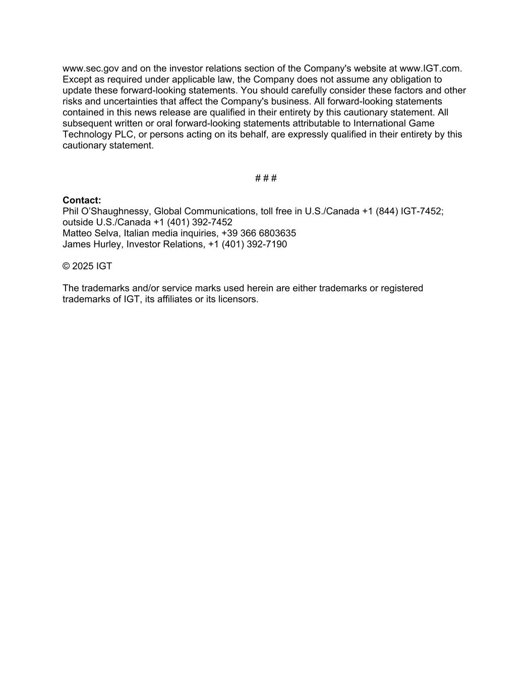 www.sec.gov and on the investor relations section of the Company's website at www.IGT.com. Except as required under applicable law, the Company does not assume any obligation to update these forward-looking statements. You should carefully consider these factors and other risks and uncertainties that affect the Company's business. All forward-looking statements contained in this news release are qualified in their entirety by this cautionary statement. All subsequent written or oral forward-looking statements attributable to International Game Technology PLC, or persons acting on its behalf, are expressly qualified in their entirety by this cautionary statement. # # # Contact: Phil O’Shaughnessy, Global Communications, toll free in U.S./Canada +1 (844) IGT-7452; outside U.S./Canada +1 (401) 392-7452 Matteo Selva, Italian media inquiries, +39 366 6803635 James Hurley, Investor Relations, +1 (401) 392-7190 © 2025 IGT The trademarks and/or service marks used herein are either trademarks or registered trademarks of IGT, its affiliates or its licensors.