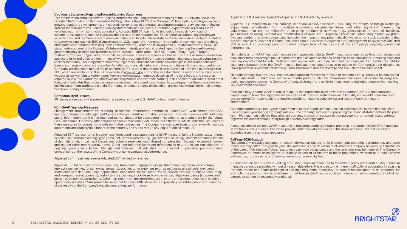 Q4'25 Select Performance and KPI Data $ in millions except otherwise noted (1) Same-store sales represent the change in wagers recorded in lottery jurisdictions where Brightstar is the operator or facilities management supplier, using the same lottery jurisdictions and perimeter for comparisons between periods (2) Instant ticket & draw game same-store sales normalized for a like number of Italy Lotto draws and sell-in days were 0.3% and 2.9% in Q4’25 and FY’25, respectively 04 APPENDIX BRIGHTSTAR EARNINGS REPORT - Q4'25 AND FY'2520 Revenue Q4'25 Q4'24 Y/Y Change Constant Currency Change FY'25 FY'24 Y/Y Change Constant Currency Change Service Instant ticket & draw wager-based revenue 530 511 4% (2%) 2,058 1,989 3% 1% U.S. multi-state jackpot wager-based revenue 38 26 46% 46% 106 101 5% 5% Upfront license fee amortization (69) (49) (42%) (29%) (223) (198) (12%) (7%) Other 111 103 8% 5% 420 471 (11%) (12%) Total service revenue 611 591 3% (1%) 2,360 2,363 —% (2%) Product sales 57 60 (4%) (9%) 151 149 1% (1%) Total revenue 668 651 3% (2%) 2,511 2,512 —% (2%) Income from continuing operations 92 116 (21%) 135 271 (50%) Adjusted EBIT 177 188 (6%) (13%) 677 768 (12%) (15%) Adjusted EBITDA 304 290 5% (2%) 1,121 1,170 (4%) (7%) Same-store sales growth (%) at constant currency (wager-based growth) (1) Q4'25 Constant Currency Change Q4'24 Constant Currency Change FY'25 Constant Currency Change FY'24 Constant Currency Change Global Instant ticket & draw games 0.3% 3.9% 1.6% 1.1% U.S. multi-state jackpots 43.6% (20.2%) 3.4% (22.1%) Total 3.5% 1.8% 1.7% (0.8%) U.S. Instant ticket & draw games 0.1% 2.2% 0.3% (0.5%) U.S. multi-state jackpots 43.6% (20.2%) 3.4% (22.1%) Total 4.7% (0.7%) 0.6% (3.3%) Italy Instant ticket & draw games (0.5%) (2) 7.0% 2.0% (2) 4.1% Rest of world Instant ticket & draw games 5.0 % 5.6 % 8.0 % 3.3 %