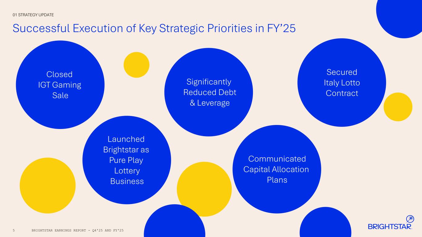 5 Successful Execution of Key Strategic Priorities in FY’25 01 STRATEGY UPDATE Launched Brightstar as Pure Play Lottery Business Communicated Capital Allocation Plans Significantly Reduced Debt & Leverage Closed IGT Gaming Sale Secured Italy Lotto Contract BRIGHTSTAR EARNINGS REPORT - Q4'25 AND FY'25