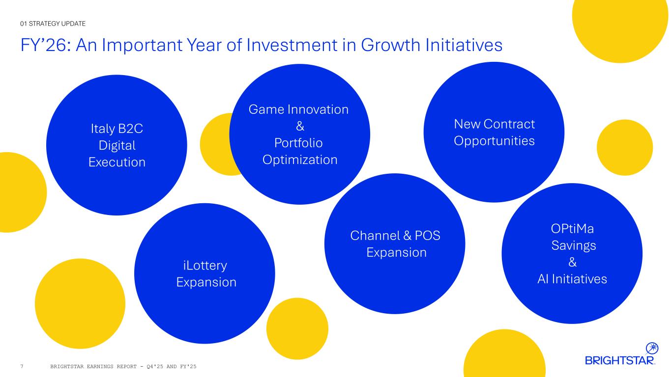 6 FY’25 Profit & Cash Flow Highlight Brightstar’s Attractive Business Model 01 STRATEGY UPDATE >$1.1B FY’25 Adjusted EBITDA* Returned >$1B to Shareholders Cash Generation Funds Key Initiatives Diversity of Portfolio Drives Q4 & FY’25 Same-store Sales (SSS) Growth Double-digit Percentage Increase in Quarterly Cash Dividend BRIGHTSTAR EARNINGS REPORT - Q4'25 AND FY'25 Net Debt Leverage* Improves to 2.4x *Non-GAAP measure; see disclaimer on page 2 and reconciliations to the most directly comparable GAAP measures in Appendix for further details