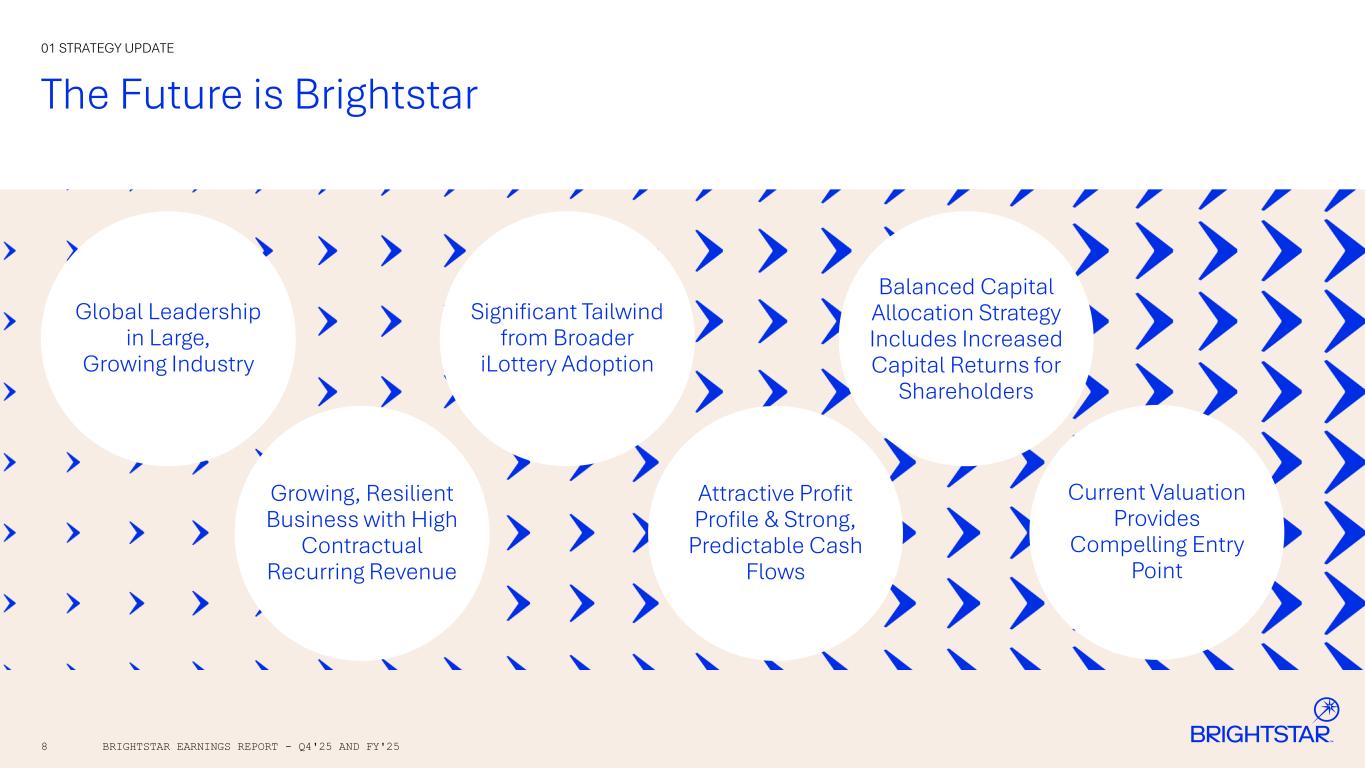 7 FY’26: An Important Year of Investment in Growth Initiatives 01 STRATEGY UPDATE BRIGHTSTAR EARNINGS REPORT - Q4'25 AND FY'25 iLottery Expansion Game Innovation & Portfolio Optimization Italy B2C Digital Execution Channel & POS Expansion New Contract Opportunities OPtiMa Savings & AI Initiatives