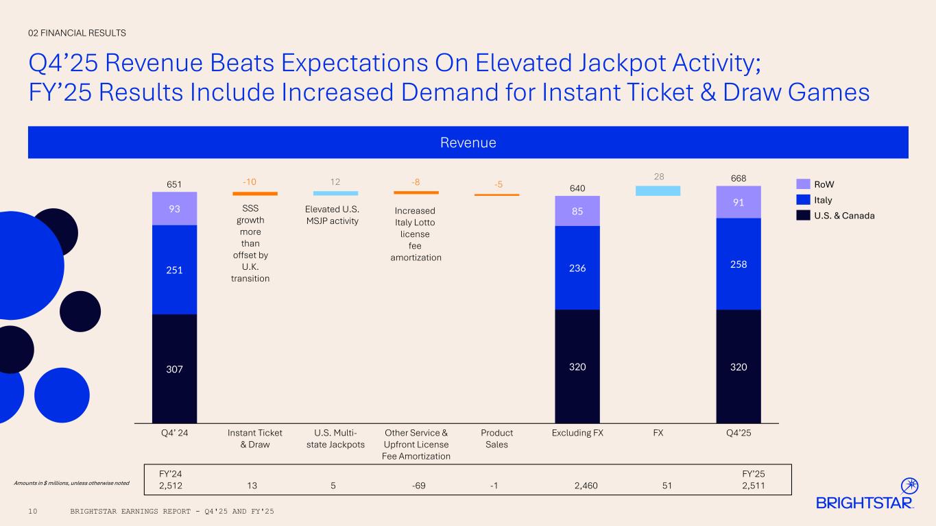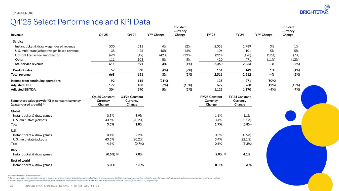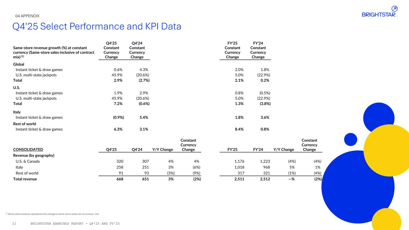 Q4'25 Select Performance and KPI Data (1) Same-store revenue represents the change in same-store sales net of contract mix 04 APPENDIX BRIGHTSTAR EARNINGS REPORT - Q4'25 AND FY'2521 Same-store revenue growth (%) at constant currency (Same-store sales inclusive of contract mix) (1) Q4'25 Constant Currency Change Q4'24 Constant Currency Change FY'25 Constant Currency Change FY'24 Constant Currency Change Global Instant ticket & draw games 0.6% 4.3% 2.0% 1.8% U.S. multi-state jackpots 45.9% (20.6%) 5.0% (22.9%) Total 2.9% (2.7%) 2.1% 0.2% U.S. Instant ticket & draw games 1.9% 2.9% 0.8% (0.5%) U.S. multi-state jackpots 45.9% (20.6%) 5.0% (22.9%) Total 7.2% (0.6%) 1.3% (3.8%) Italy Instant ticket & draw games (0.9%) 5.4% 1.8% 3.6% Rest of world Instant ticket & draw games 6.3% 3.1% 8.4% 0.8% CONSOLIDATED Q4'25 Q4'24 Y/Y Change Constant Currency Change FY'25 FY'24 Y/Y Change Constant Currency Change Revenue (by geography) U.S. & Canada 320 307 4% 4% 1,176 1,223 (4%) (4%) Italy 258 251 3% (6%) 1,018 968 5% 1% Rest of world 91 93 (3%) (9%) 317 321 (1%) (4%) Total revenue 668 651 3% (2%) 2,511 2,512 —% (2%)