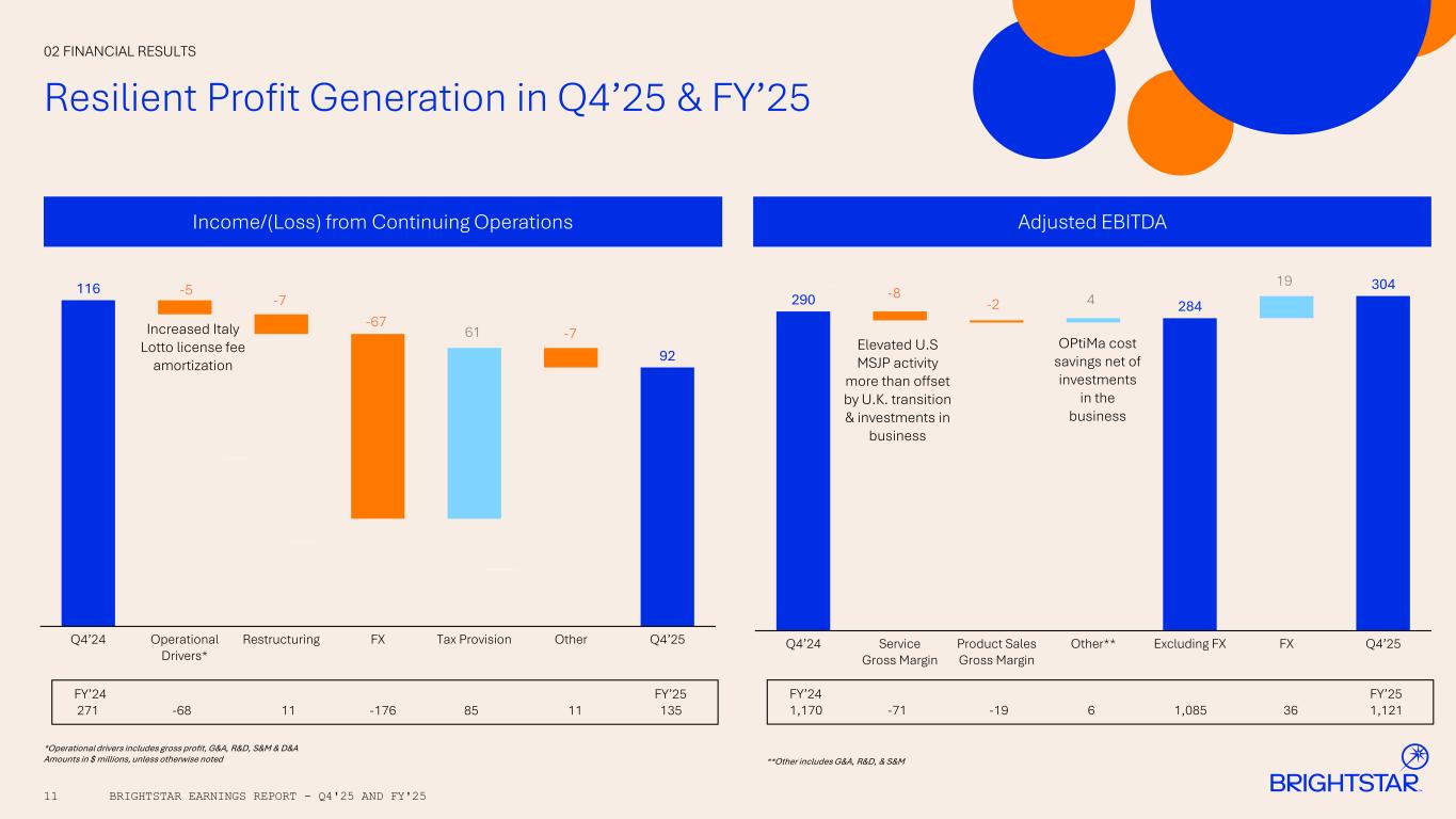 10 Q4’25 Revenue Beats Expectations On Elevated Jackpot Activity; FY’25 Results Include Increased Demand for Instant Ticket & Draw Games 02 FINANCIAL RESULTS Revenue BRIGHTSTAR EARNINGS REPORT - Q4'25 AND FY'25 307 320 320 251 236 258 93 85 91 Q4’ 24 Instant Ticket & Draw U.S. Multi- state Jackpots Other Service & Upfront License Fee Amortization Product Sales Excluding FX FX Q4’25 651 640 668 RoW Italy U.S. & Canada Elevated U.S. MSJP activity Increased Italy Lotto license fee amortization -10 12 -8 -5 28 Amounts in $ millions, unless otherwise noted SSS growth more than offset by U.K. transition FY’24 FY’25 2,512 13 5 -69 -1 2,460 51 2,511