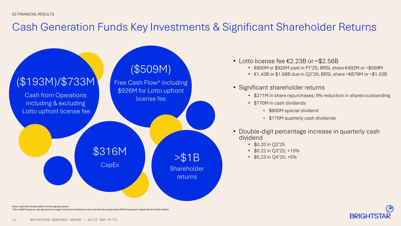 Income/(Loss) from Continuing Operations Adjusted EBITDA 11 Resilient Profit Generation in Q4’25 & FY’25 02 FINANCIAL RESULTS BRIGHTSTAR EARNINGS REPORT - Q4'25 AND FY'25 290 284 304 Q4’24 Service Gross Margin Product Sales Gross Margin Other** Excluding FX FX Q4’25 -8 19 -2 4 Elevated U.S MSJP activity more than offset by U.K. transition & investments in business *Operational drivers includes gross profit, G&A, R&D, S&M & D&A Amounts in $ millions, unless otherwise noted **Other includes G&A, R&D, & S&M -5 -7 OPtiMa cost savings net of investments in the business 116 92 Q4’24 Operational Drivers* Restructuring FX Tax Provision Other Q4’25 -67 61 -7Increased Italy Lotto license fee amortization FY’24 FY’25 271 -68 11 -176 85 11 135 FY’24 FY’25 1,170 -71 -19 6 1,085 36 1,121